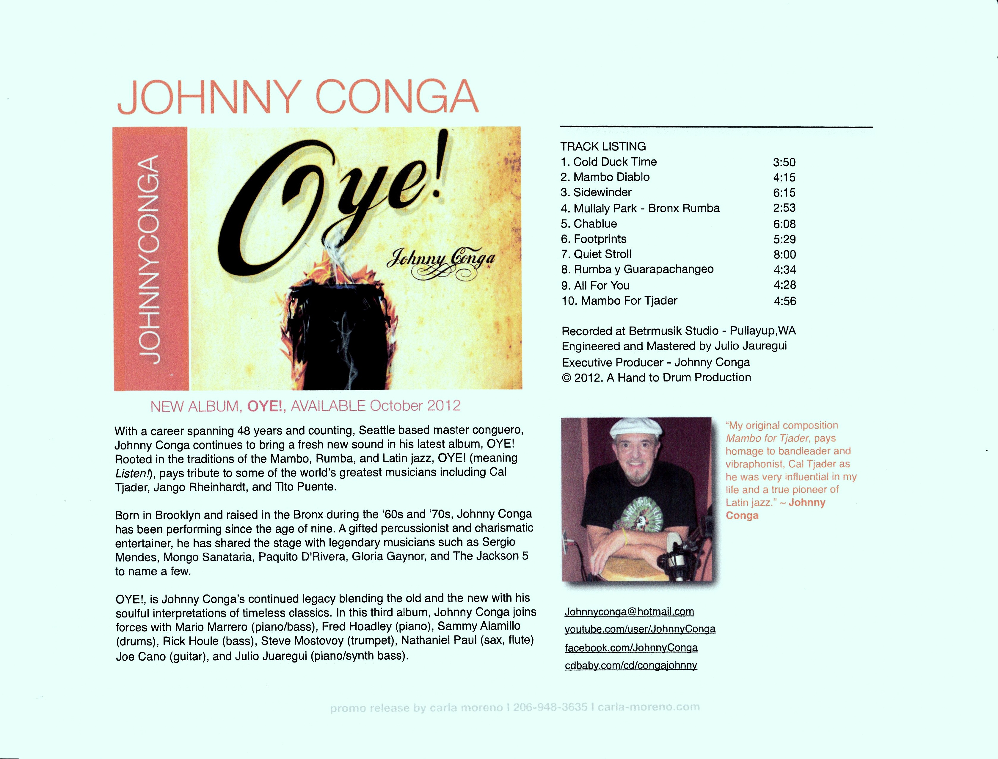 Johnny Conga has given the impression that he is an exceptionally quiet musician, releasing one album, Breaking Skin in 2009 and now, Oye!. In reality, however, he has a long career spanning 45 years.