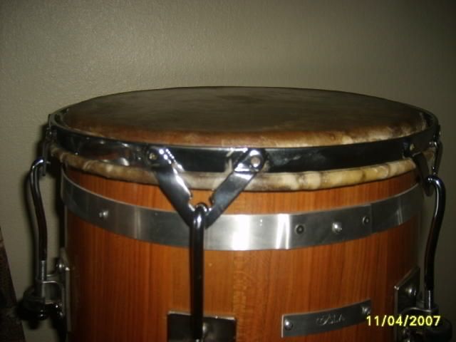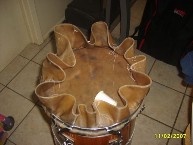 Okay, enough about that.....I wound up mounting a set of skins once, in fact they were on my Islas too, and when they cured/dried, they were a bit too high even for my taste. Here's what I did, and some of you will probably cringe at the sound of it....I tuned them to a relatively high pitch, not too high though. I then put a wet wash cloth on the drum head. I folded the corners to make sure that none of the cloth was hanging over the side of the head. I then took a small cup of water and poured a bit more onto the cloth (I repeated this process throughout the day/night which either you are able to do). I made sure that the water gradually absorbed into the head/skin, after a bit....I would take the cloth off and tap the head to check if it was dampened enough to stretch. Knowing that I had tuned it prior to beginning this process, I could tell that the head was ready to stretch more, I would then tighten each tension rod just a bit more (bringing the tune of the drum back up).