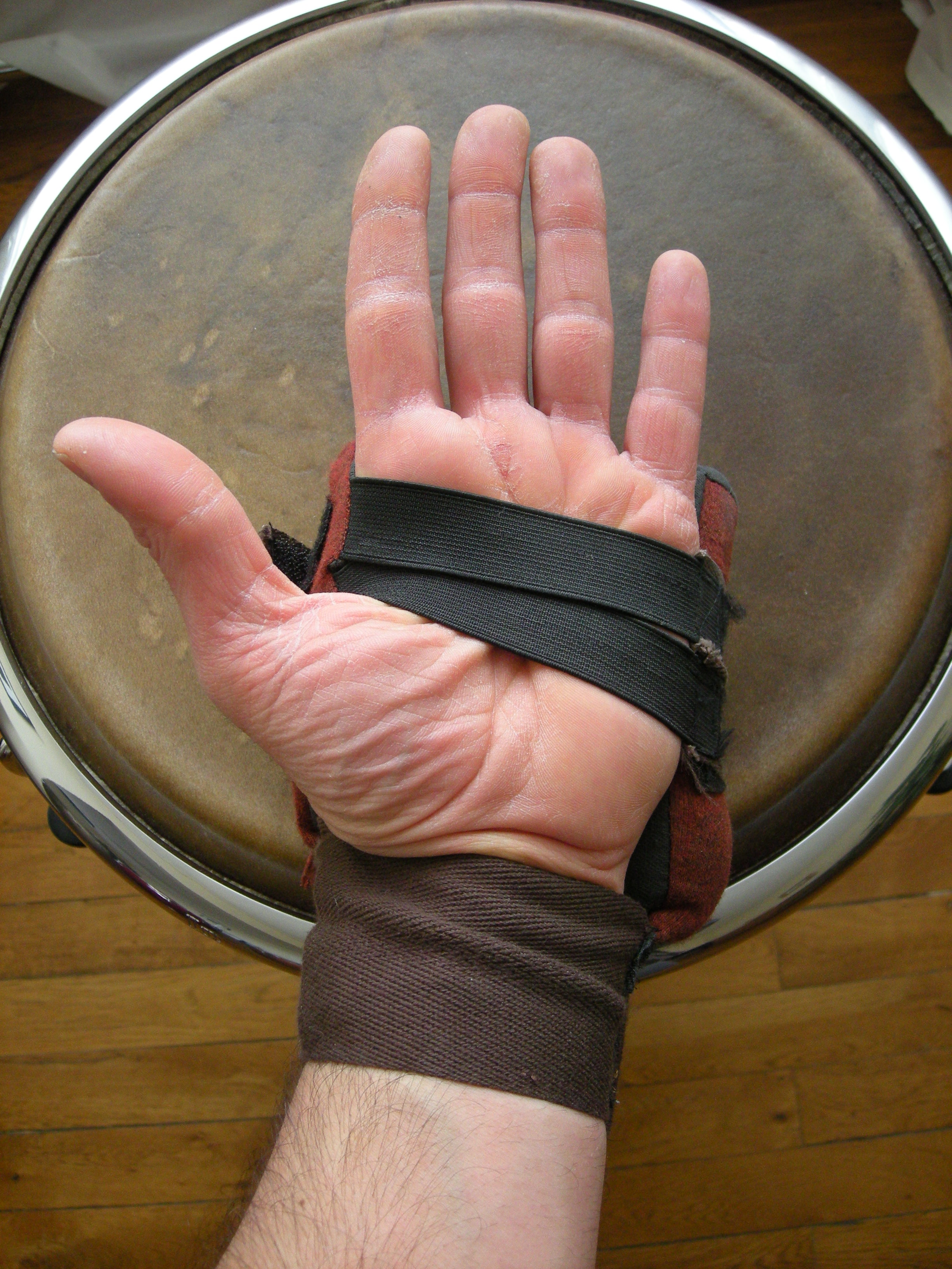 I'm new in congas drums,so i'm trying to develop basic movements.My left hand is not to strong and it's being hard to make good heel-toe movements.I thougt that I could improve the strenght and speed of my left hand whit this "gloove".is basicly a sac whit sand.I play rudiments for about 45m,and the funny thing is that after taking the gloove away,my hand just fly.I dont know if is a good ideia,but I can see clearly the improvements.