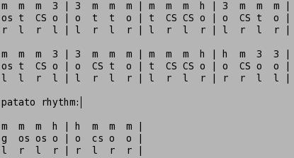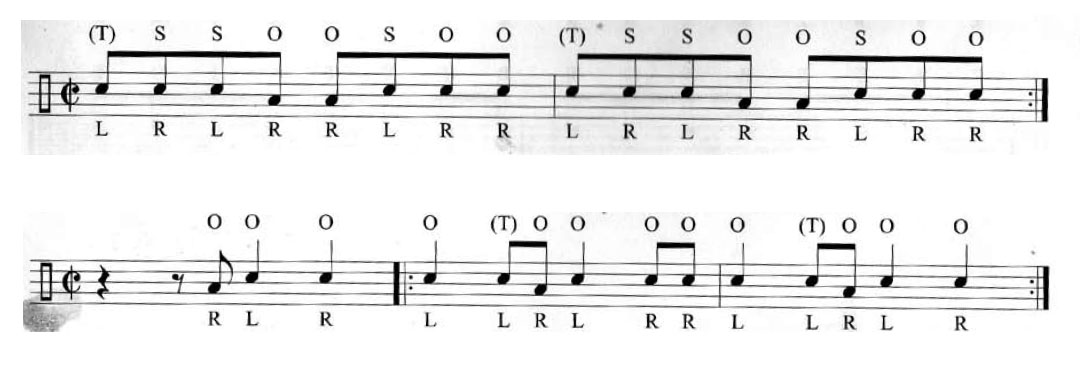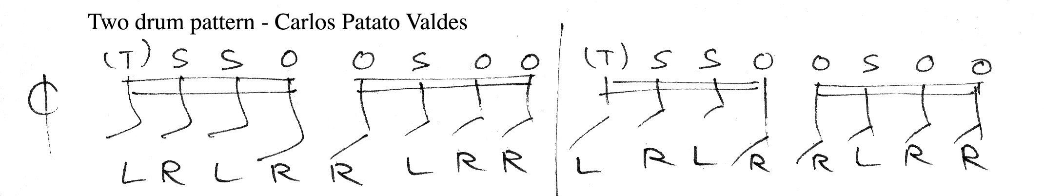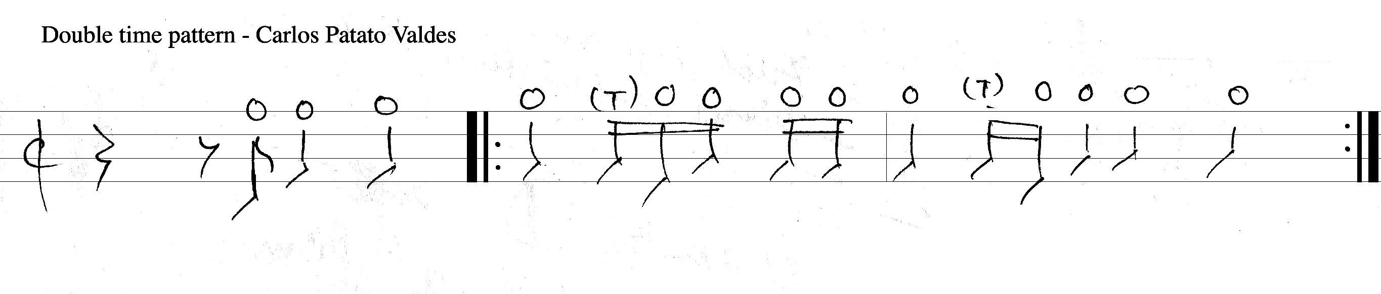 I'm thinking the one starts as above.(cs close slap, o open, g ghost, os open slap, CAPs means on the tumba) For the double time version, I'm not even sure what the pattern is, it seems so different.
