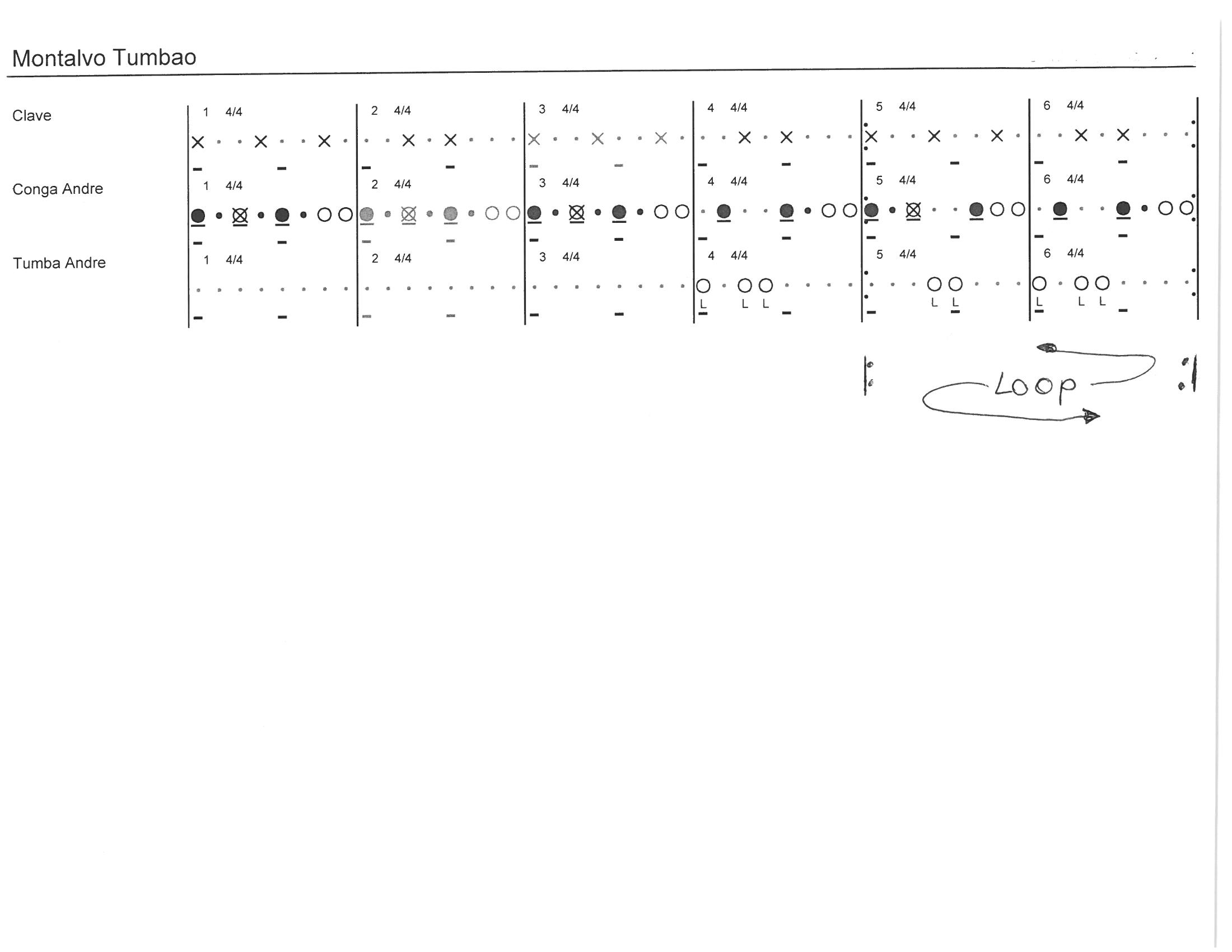 I don't know the program (Percussion Studio) you used to do the transcription but just reading it through you should be able to see that it is wrong in several places. To get you started, 3 errors are that a) the song, and the tumbao variation, are in 2/3 clave not 3/2 (listen to the phrasing of the singer and the bongo bell), b) the open tones on the tumba are not all Left hand and c) the rhythm as written for the tumba is wrong. Sometimes you hear rhythms better when you are dancing. There are more errors you should be able to find (eg, missing slaps, muffs etc) if you listen and analyze what you are hearing. Standard music notation would be easier for most people to decode, but I don't know how to do it in this website software either. If you want to continue using your notation at least give us a key to what is a slap, what is an open tone, what is a muff tone, what is a bass, what is the meaning of the greyed out measure, and what is a personal timing light touch? It is a 2 bar (1 clave) phrase that repeats so you really only need to write 2 bars.