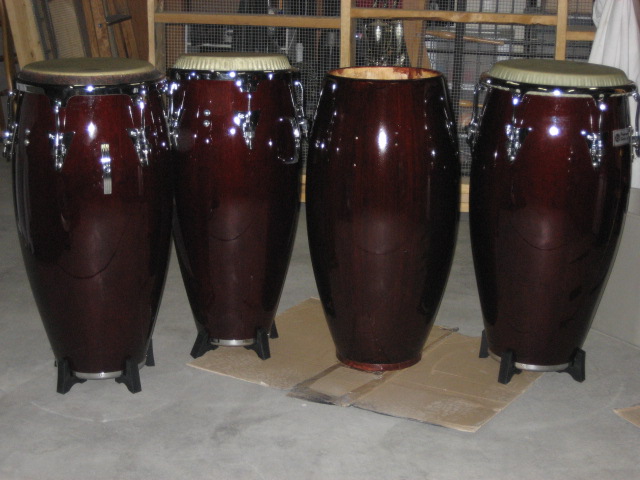 Well I'm making some headway now. I got my first coat of clear coat on now, & it really makes a difference. At least 4-5 coats on this will make it look how I want it to. Here are some pics showing before and after. I included a pic of the drum next to the 3 new ones I got so you can see how lucky I got finding a stain to match the new drums.