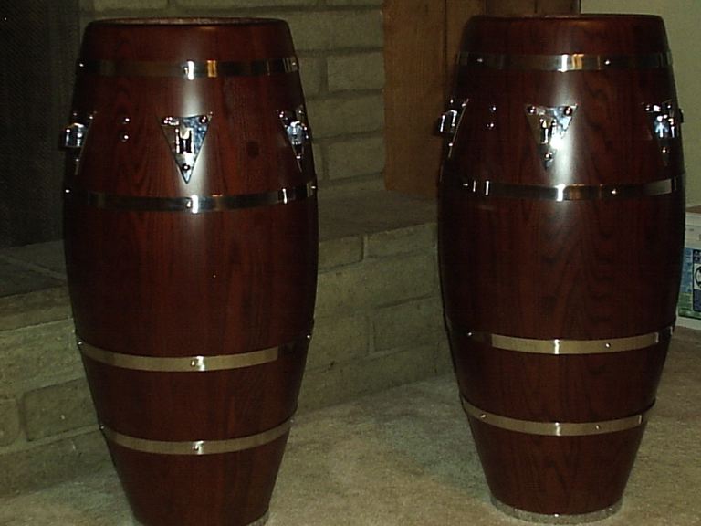 As for the type of wood, bro, all I can say is that they were the HEAVIEST drums I have ever owned. I can't say with authority, but there have been drum makers with whom I spoke with about these drums, and they said that they are made of compressed wood. I just know that when I sanded them down, they looked like wooden staves to me. In any case the finish that I applied was a store bought one, if you look up the thread you'll find out which one it was. Sorry, with old age comes short term memory loss! The truth of the matter though is that, they sounded good before any alterations, and morphed into greater sounding and looking drums after wards.