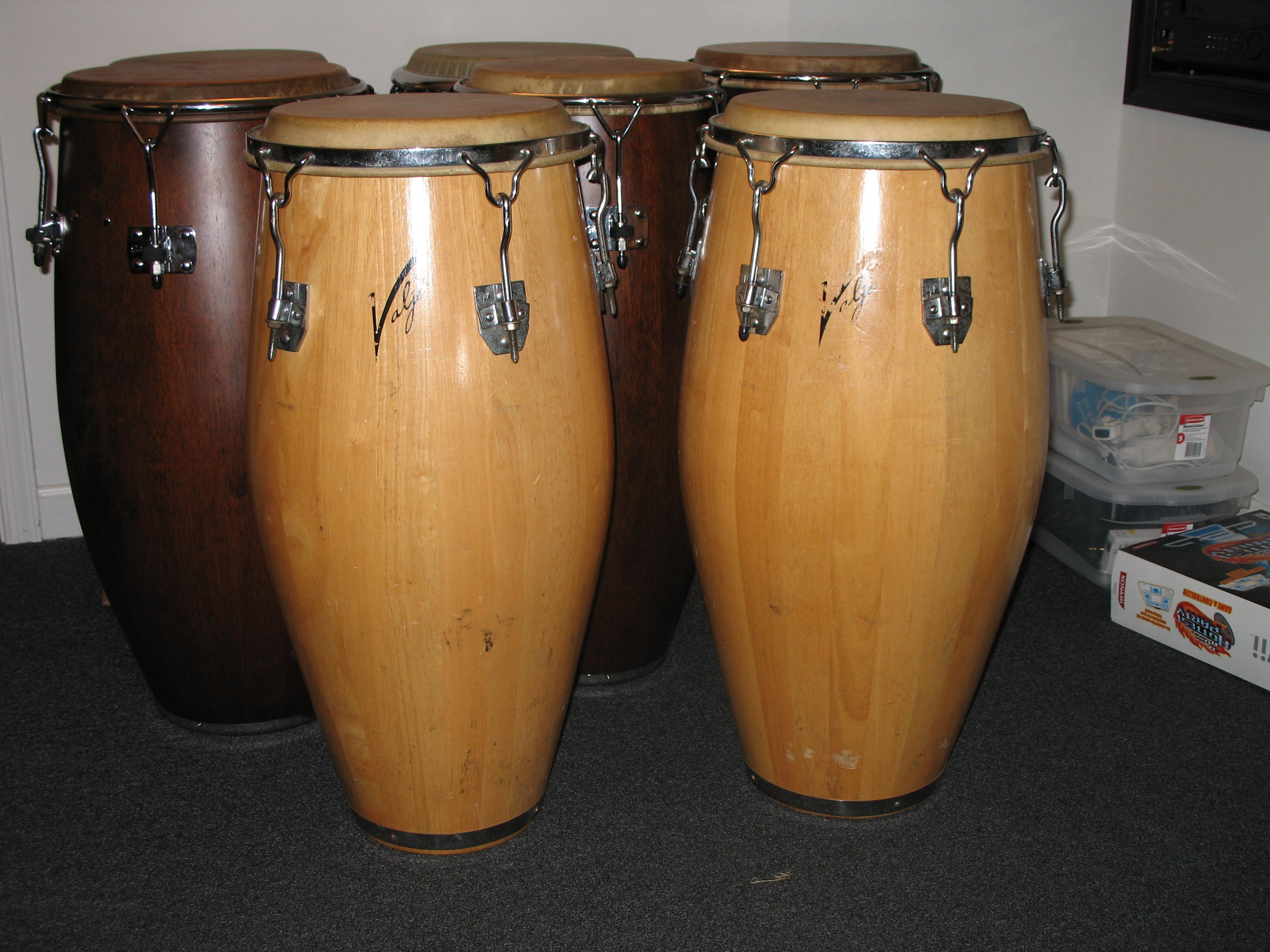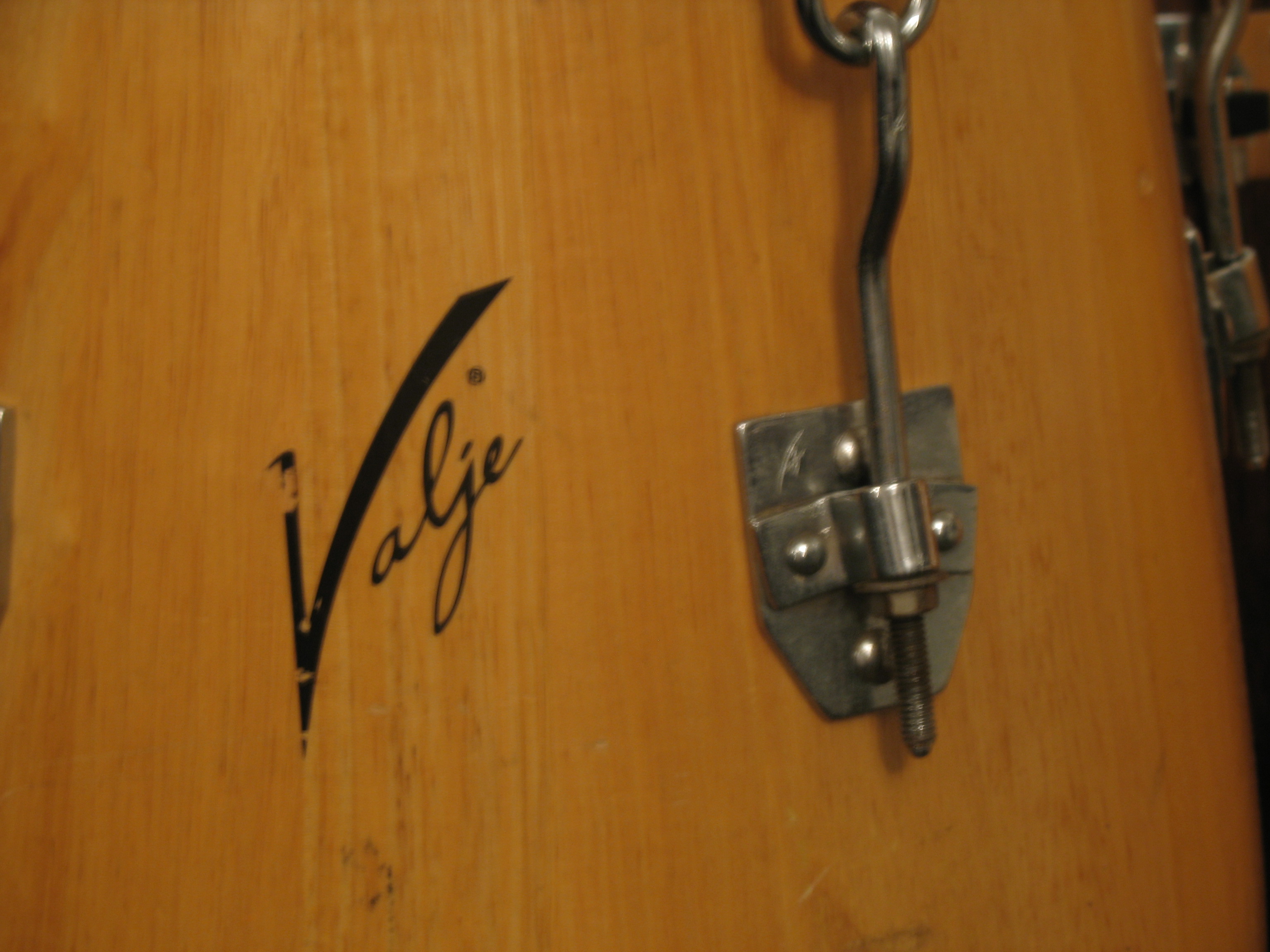 Wood: Akbar (SF Valjes, c. 1983 -1986) used really tight-grained quarter-sawn oak, typically with lots of dark flecks in the grain like you see in the photos below. Your drums look to have a very different looking oak, not cut the same way, from the same source, or finished the same.