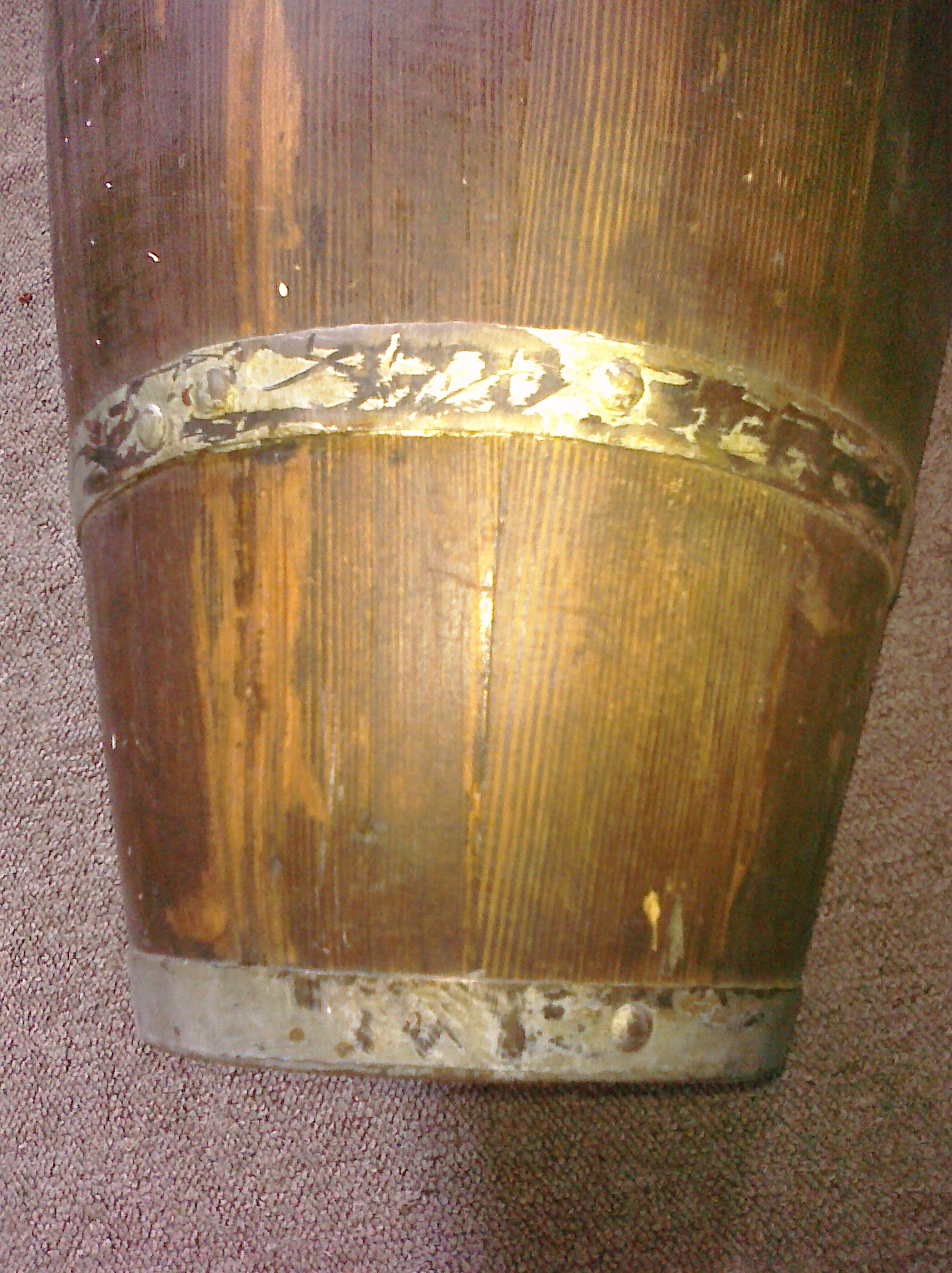 Anyone out there know what this one might be? Don't know any history. Was told it is Cuban. Extremely light. Looks like mahogany. Some sort of thick black pitch inside coating. Needs cleaning up but seems to be in great condition. Wide staves. Beautiful shape. No cracks. Thick bands. Original alma has a 4 inch gap - looks like it was put on that way. Belongs to a friend of mine. I'll probably buy it from him. He has the crown somewhere. It's been in a garage for many years.