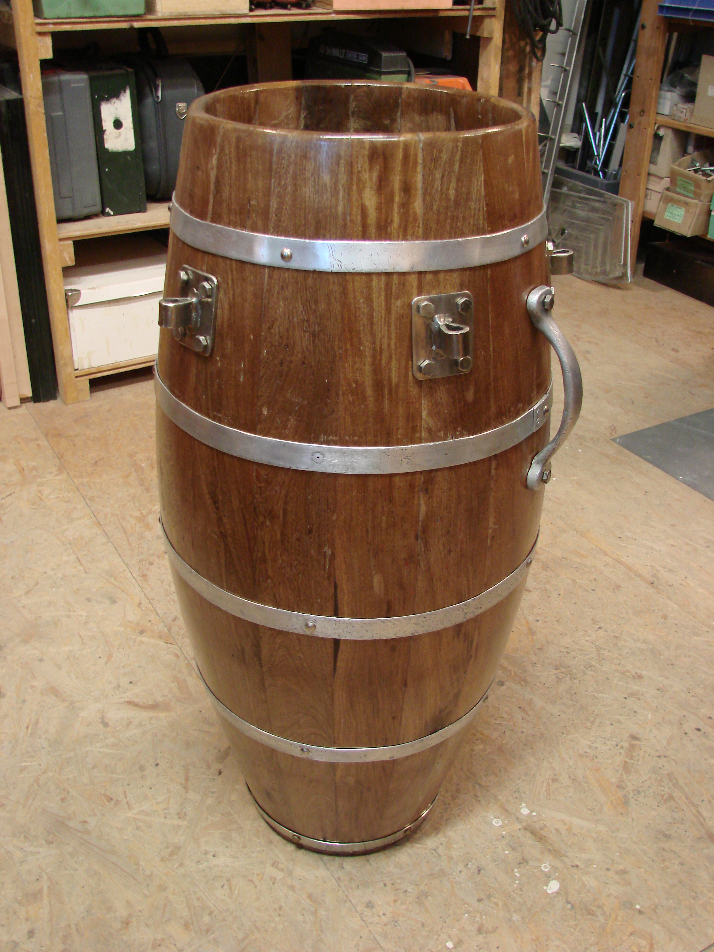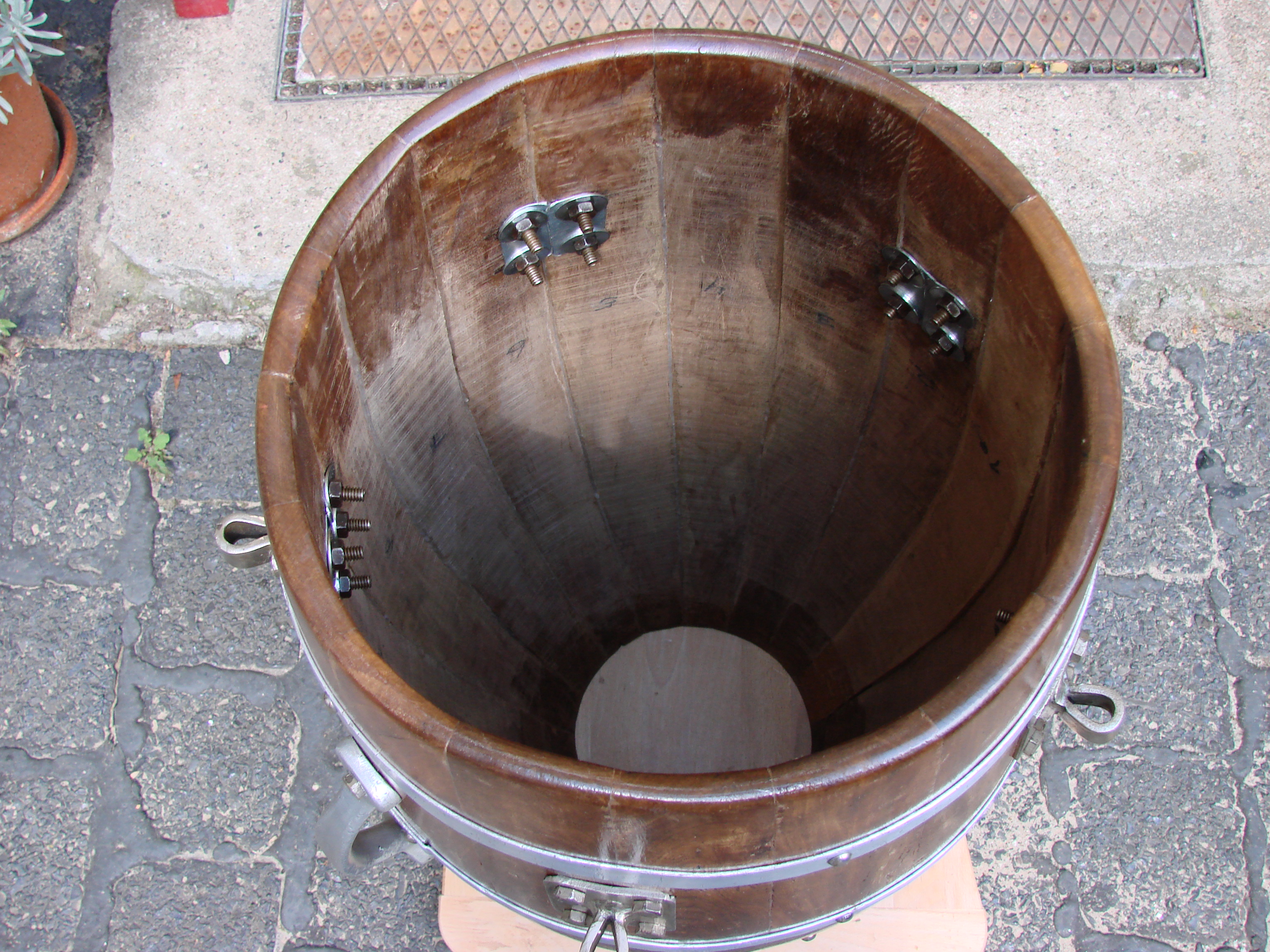 It's actually a dead on 11" Tumbadora and not 101/2" as i previously stated. I guess my measurement was thrown off by the inconsistancies due to its miserable original condition. The Aluminum bands had all stretched a bit over time due to the splits in the staves and wood movement. So, I had to cut and rivet one of them to accomodate an even spacing when reattaching them. Intersting thing about these bands; I couldn't find a single weld seam in them. My only guess is that they were cut from high end Aluminum tubing. All the hardware is original with the exception of the washers for the plate lugs and as I mentioned, I'm making new Tuning lugs from material I already have around. For what it's worth, to date I've spent a total of 2,85 Euros on this project. I thought I had lost a couple of the upholstery nails for the bands, but then I found them after I took these photos.