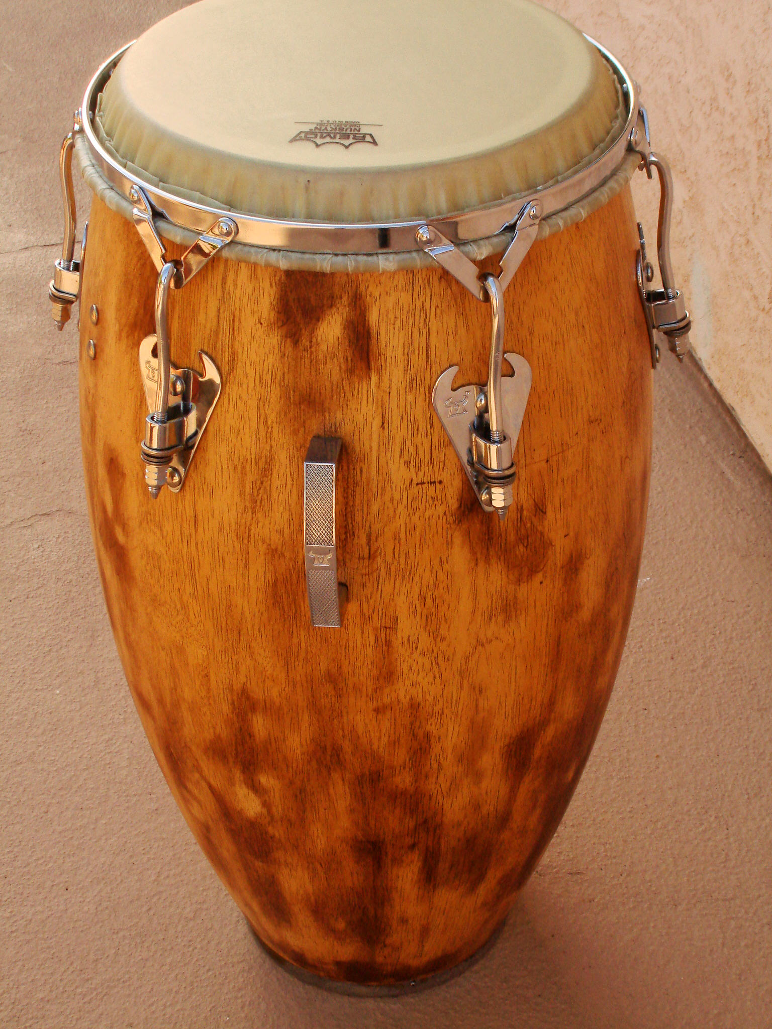 AWESOME PHOTO OF YOU, WITH YOUR OLD SCHOOL LOOKING MATADOR QUINTO! ALSO, THANK YOU FOR THE PROPS. AS YOU CAN SEE IN THE PHOTO, THIS CONGA WAS ORIGINALLY FINISHED IN NATURAL LIGHT WOOD, WITH A COMFORT CURVE CROWN. IT'S THE CONGA ON FAR LEFT. I HAVE STRIPPED IT DOWN, SANDED IT FROM ROUGH TO SMOOTH AND HIT IT WITH STEEL WOOL. I DID NOT REMOVE ANY SURFACE MARKS, AND HAVE EVEN EHANCED THIER APPEARANCE BY ADDING EXTRA STAIN IT THOSE AREAS.