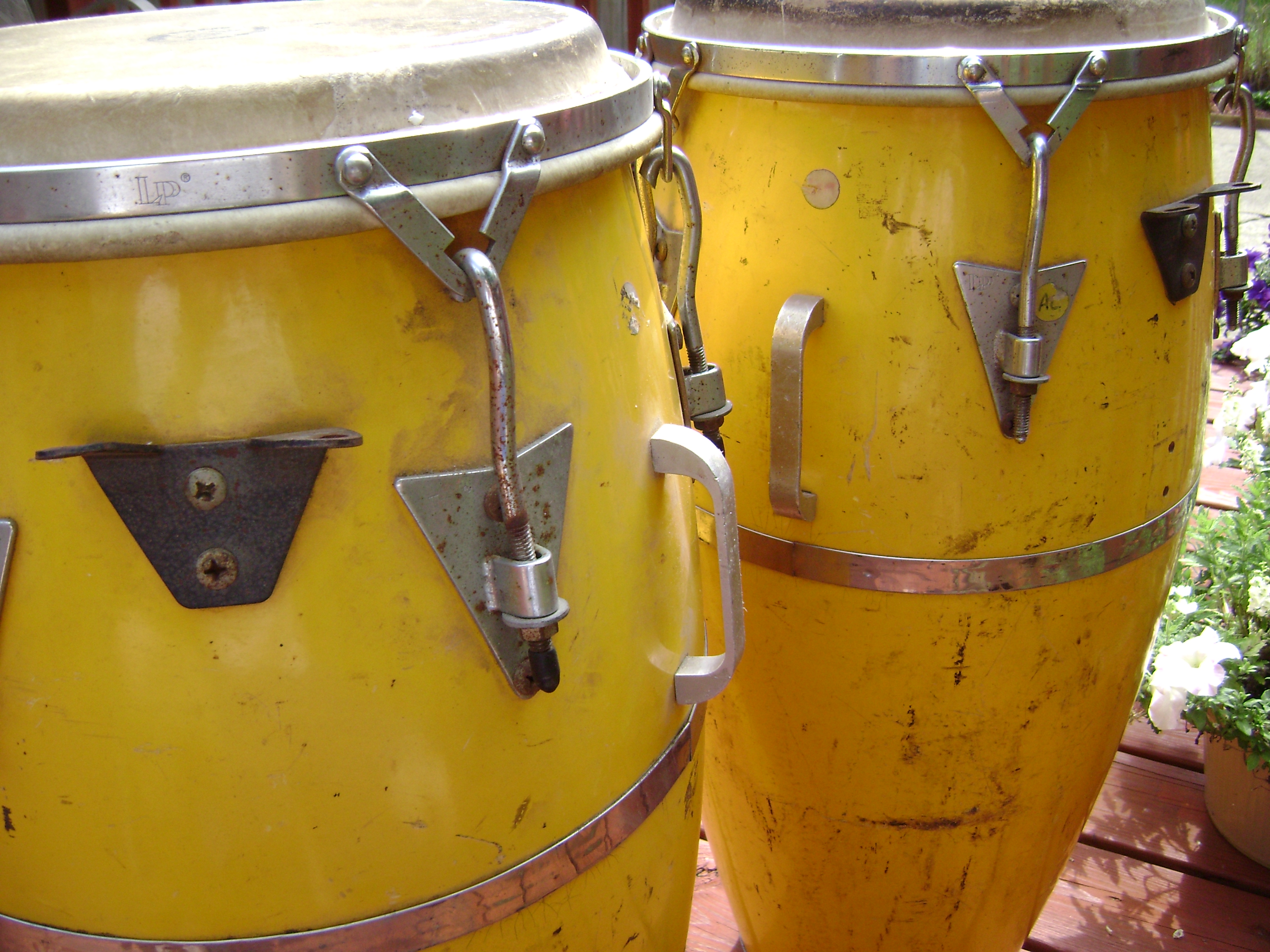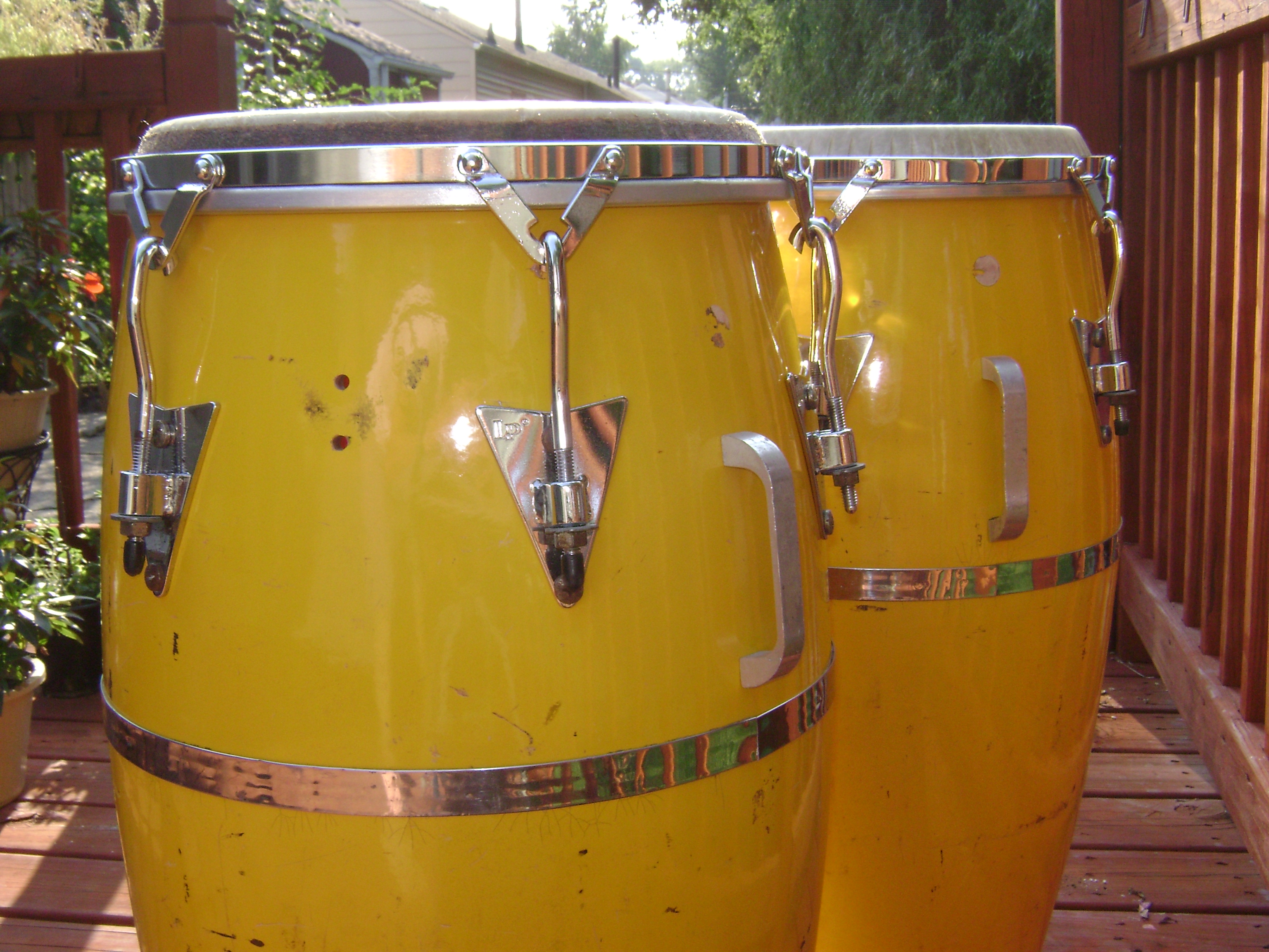 Here are my original Lp Palisades Park, New Jersey Congas. The yellow Quinto and Conga are a true pair (purchased together and never separated). I am the second owner. The gentleman I acquired these from bought them in 1973. They needed a lot of TLC. They had a lot of rust, condensation and dirt. My Tumbadora is my baby! I've had it for about 9 years. It was a true pair when I first acquired it from a good friend. At the time, I was touring with a band. After a 9/11 commemorative concert we performed in Texas, our trailer and bus was stolen. We lost everything including my Quinto (pair to my Tumba)! We were close to the Mexico border and even the cops told us that most likely our belongings were long gone over the border. Fortunately, the Tumbadoras hardware was in bad shape at the time and I had left it back home in Cleveland, Ohio. As for the look, I don't think I'll re-finish any of these (at least for now), I like the used look! I think it gives the drum a story (history) and character. ---I currently use plastic heads because the change in temperature and humidity here in Cleveland, Ohio is unpredictable (not even the meteorologist get it right). I would tune a real skin before a song and before we reach the second chorus, it would be de-tuned. The congas are loud with a brighter sound and don't weigh as much as wood, furthermore, they don't weigh as much as today's fiberglass.