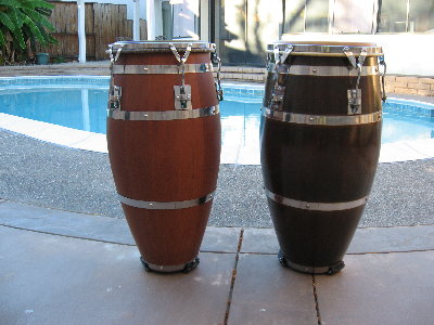 Thank's guy's: What i should of said is should i tung oil the inside of the shell. I very proud to have theses conga's and thank god i took care of them for all these year's. I just want keep them in the best shape that i can. As far as the skin go's it's dark but with in time they will lighten up as has my other B.C skin's have. Jerry: Junior knew what he was doing, all of the plate's are drilled in between the stave's as for the stave's are about 4 inch's wide. Look at those glue line's almost perfectly straight. Compare that to a Gon bop's of that era which is messy and sometimes it's there to cover a crack in the wood like smeared on. Funny thing i paid $150.00 for that conga somewhere on 42nd St. N,Y,C and i paid $170.oo for my Gon bop's quinto from Manny's in N.Y.C. I brought the quinto first and than my teacher Gene Golden told me about the store on 42nd St. I wished i would have went there first and brought both from there. There were at least 15 Junior's there.all sizes but at least 4 of them where cracked at the stave line, Cuco by chance do you know what store that was? Did Junior stop selling at Manny's and went other place's ? Here's a picture of them in the 80's.