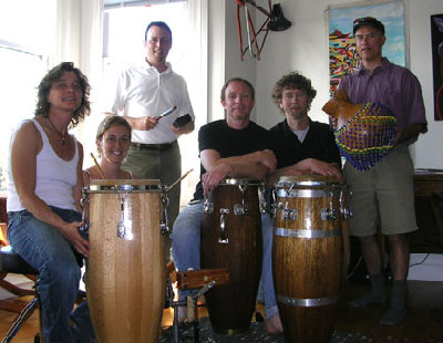 Hi Manny et al. sorry about that! You were right on all the guesses.. I'm far right with Shekere, Geordie is to James's right. The picture is taken in Geordie's apt. in San Francisco. We had all met last year at the Humboldt camp and from last year's road trip to the coast.