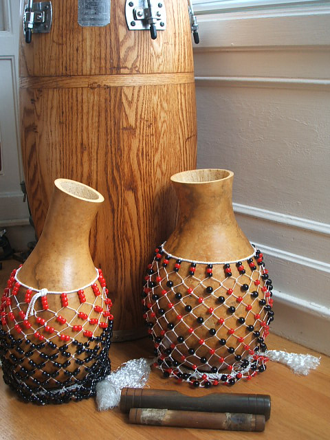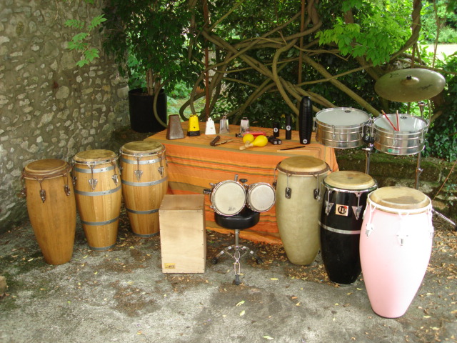 Congas left to right : First drum I made, Traditional pair, My first fiberglass, Patato LP, Pink Mama Tumba !