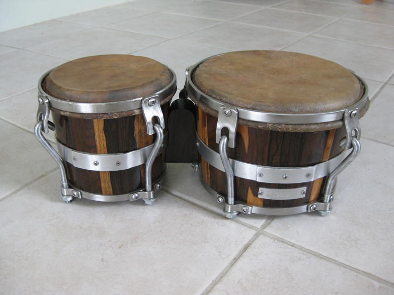 I think Mario has done a decent job with the bongos, I'm pretty sure these are his first ones, but I agree with most of the criticisms expressed. If it was up to me I would also have the older welded rims, those were cool. The band is not so bad, I think the main thing for me is it is out of scale with the little drums. If it was thinner, about the same width as the crown and bottom hoop, I think the appearance might be improved. Not a bad effort though, sometimes you just have to go with an idea and to see how it's going to come out. I would really like to hear how they sound. Mario told me the mahogany and ziricote is just too valuable not to use the cuttings from the congas and bata to make bongos.