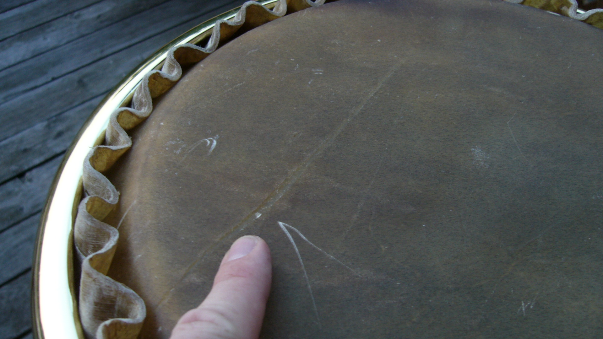 I mounted a recycled mule skin on a gon bops oak quinto last month. This skin had a really bad gash in it.. too deep for my taste. But i wanted to see if it, or how it effected the sound.