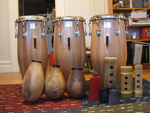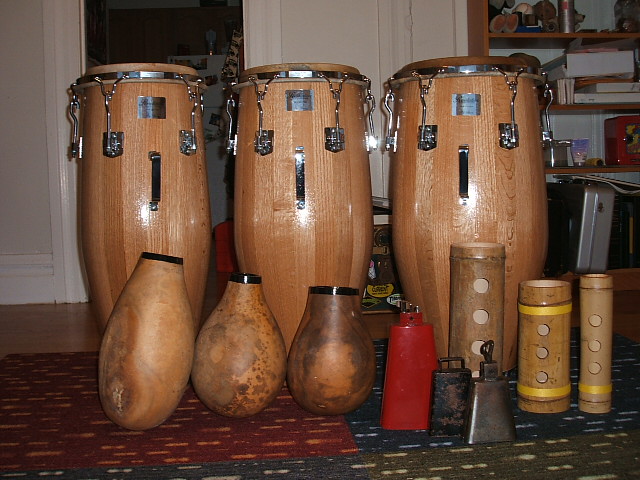 Well as to me, stick to four by four: 4 congas, two sets of bongos, two sets of timbales, 4 cowbells