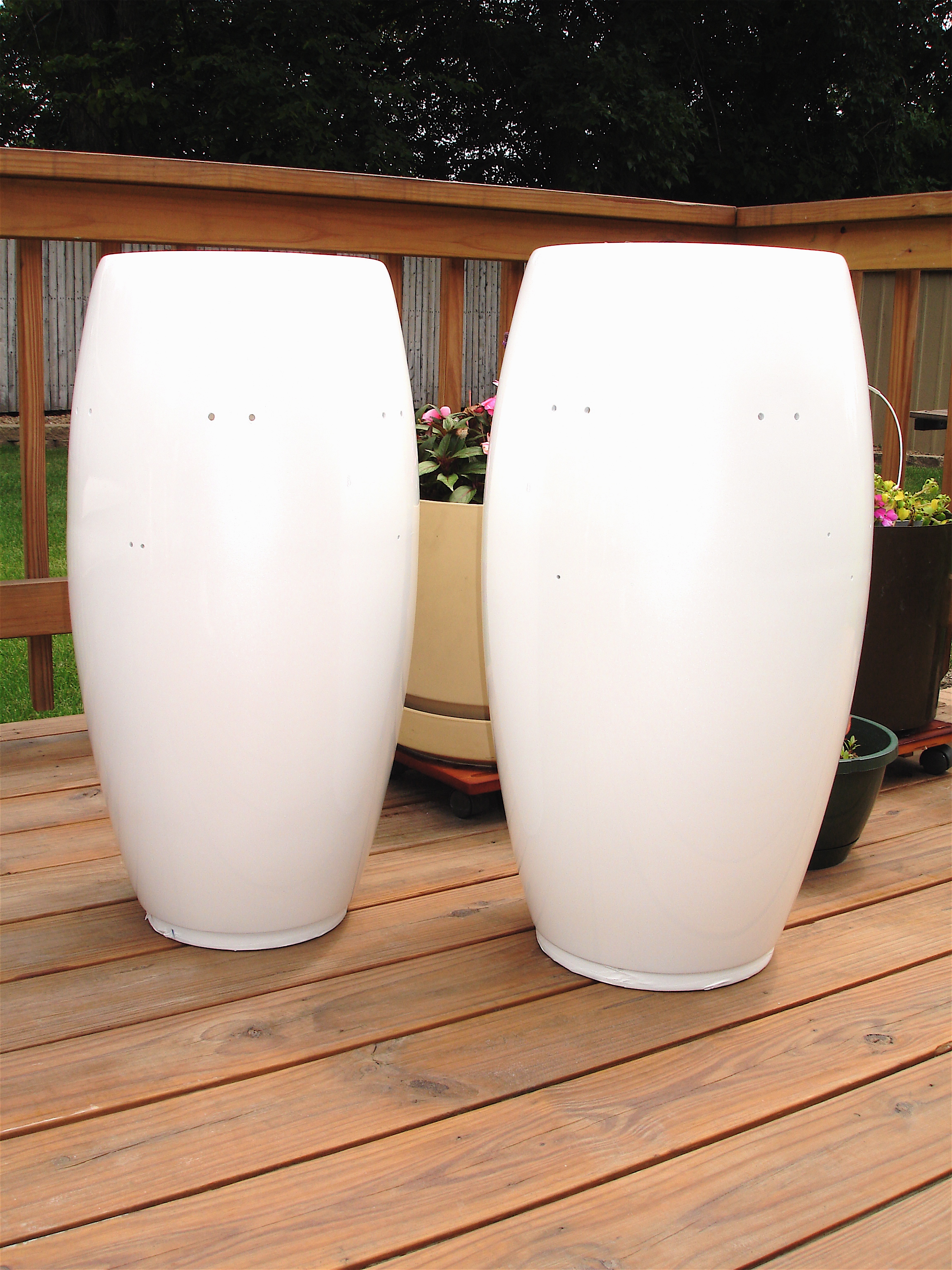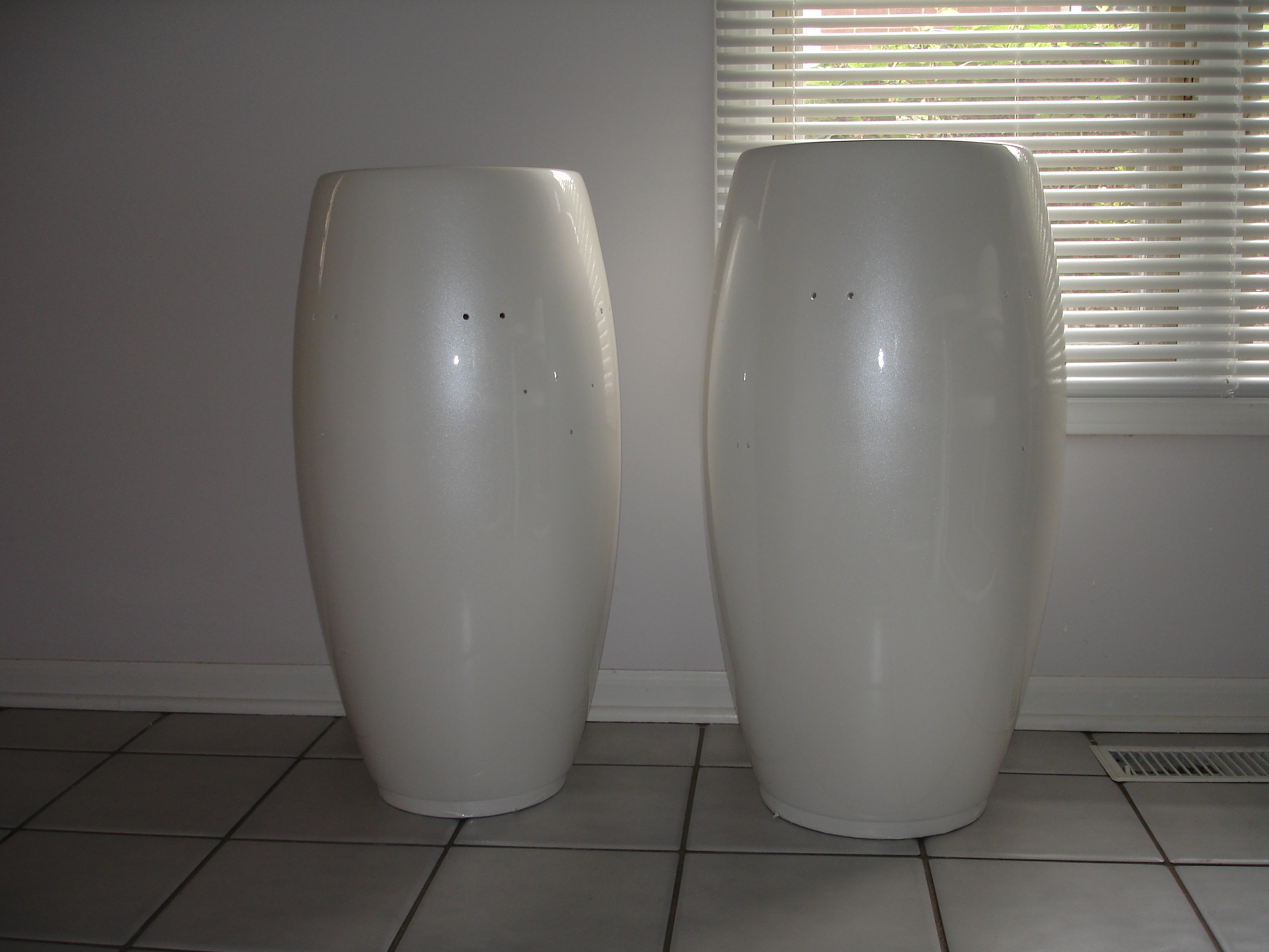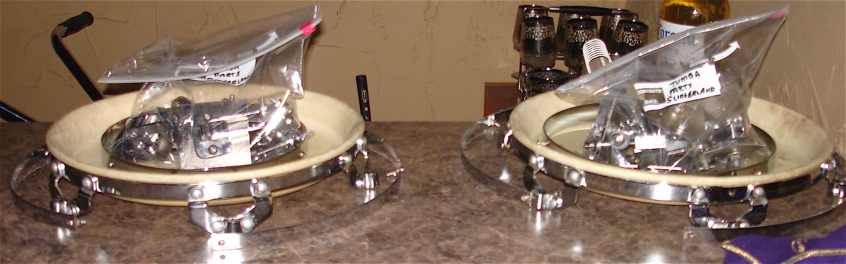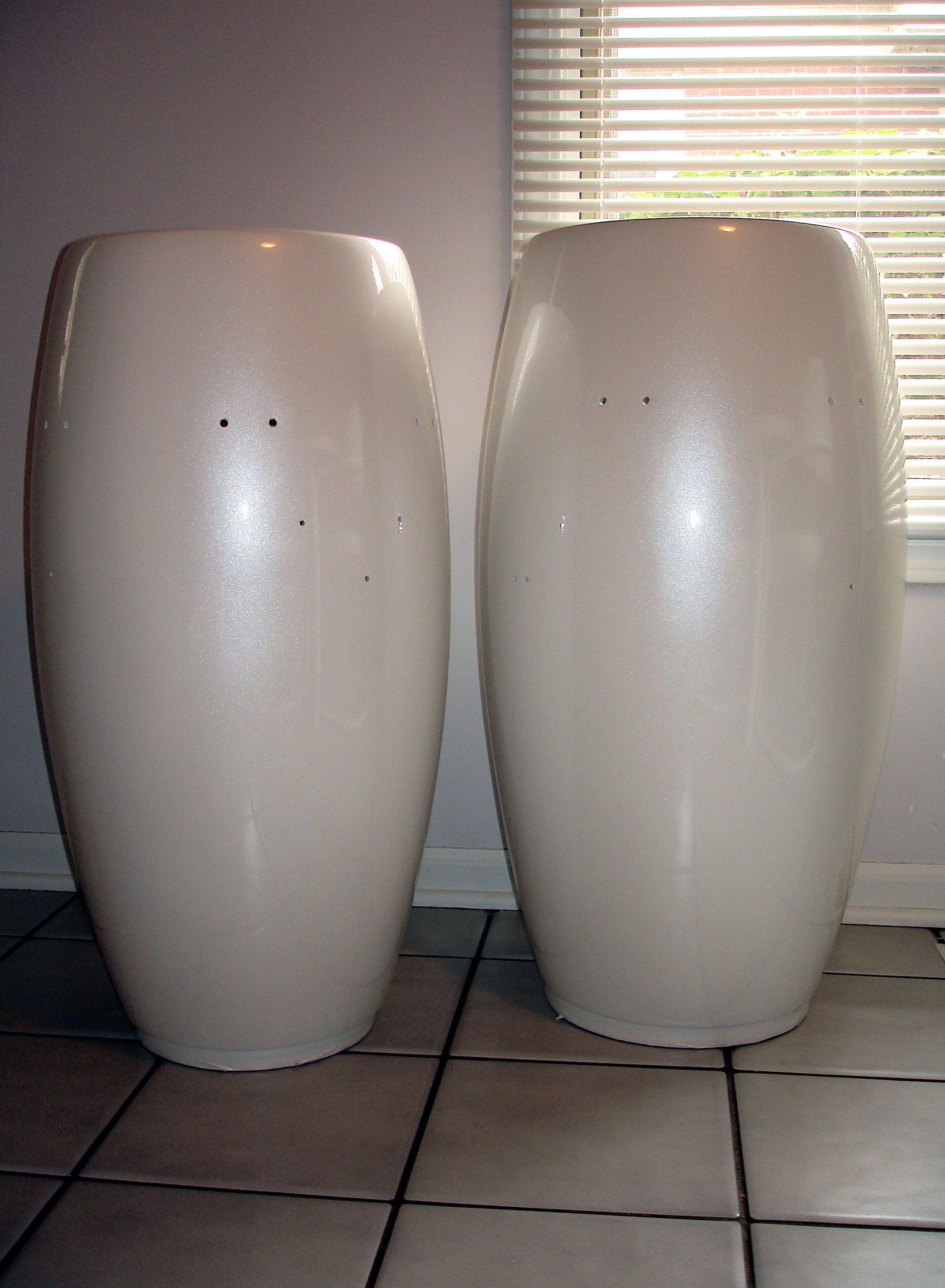 The congas are in the painters hands. I picked a high gloss pearl white with fine silver flake. The painter said it would be a base coat then the pearl coat then clear with silver flake. He also said he would seal the congas before he paints them. This painter does some of the hot rods in the neighborhood and is a expert body man and painter. I sanded by hand for over 4 hours. He said he would sand them more and seal them then do the three part paint job on them. They should look very nice when I get them back. Now I must find the time to clean up the chrome. I will post photos of the shells as soon as I get them back.