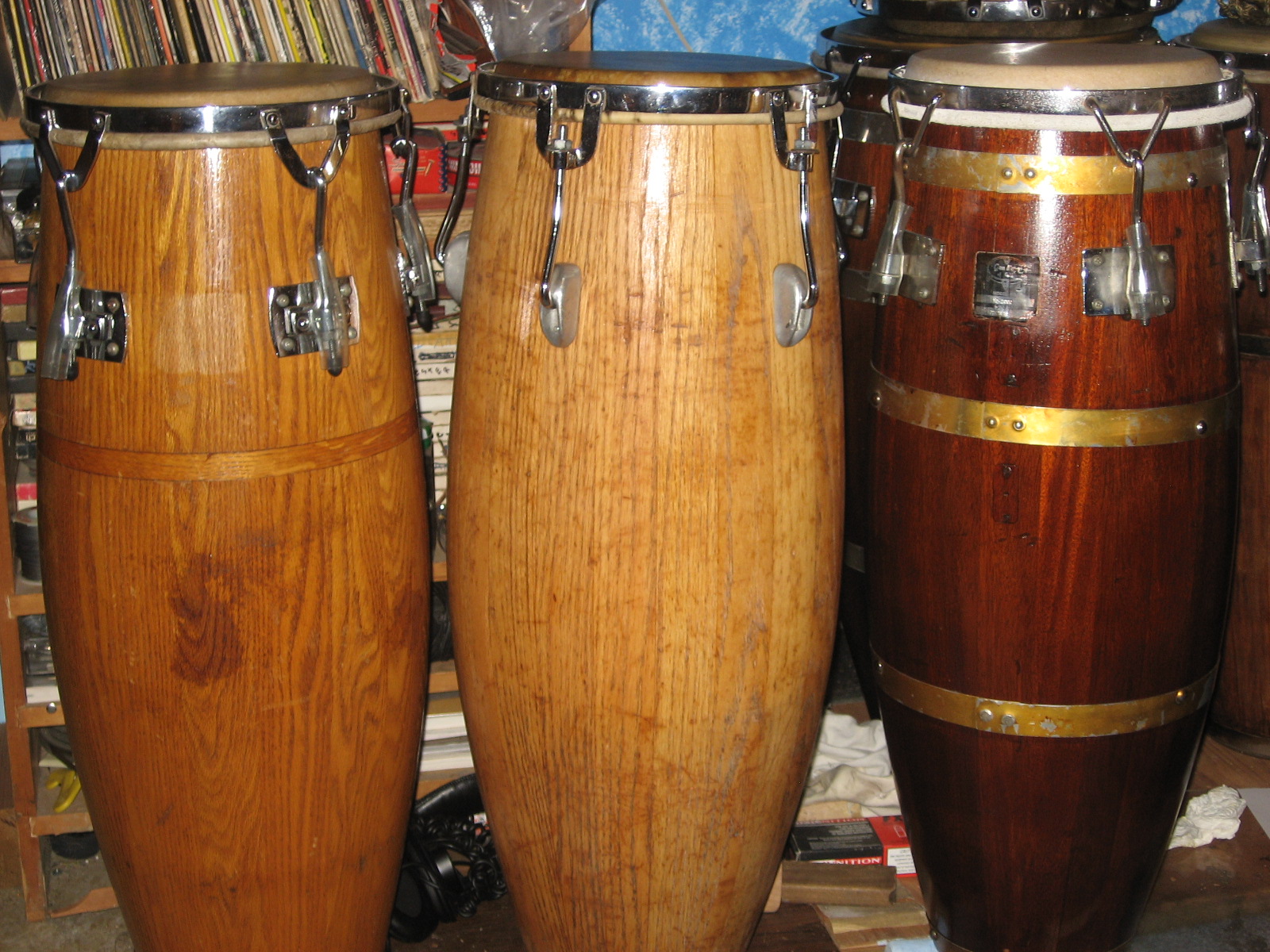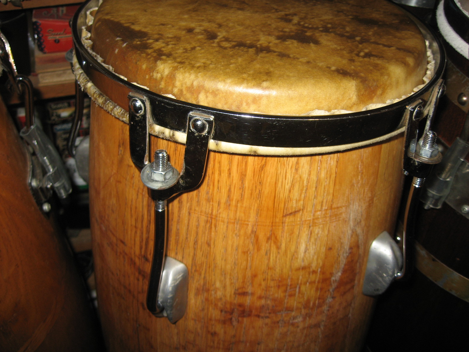 Just thought I would post a photo of a International, a Mark II and a Super series 9 3/4 inch quintos Gon Bops. For comparison and ID purposes. You hardly ever see the Mark II drums anymore they were not very popular because of the non traditional tuning hardware, its upside down and many opted to change it to more typical style hardware. Contrary to what other think and say the lugs do not hit you palms unless you really position you hands strangely. Not even someone who has not played ever can do this unless they try. The only thing with them is that they are a bit harder to tune. Like I said just for your viewing pleaseure I have another 9 3/4 GB but its behind a couple of fiberglass covered GB's which are behind some other drums well you get the idea.