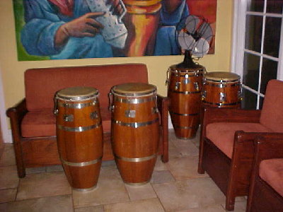 At the moment I'm getting divorced and selling some of my sets, I got plenty of stuff that I got from Mongo (his Vergara bongos, 100's of his personal photgraphs......) Julio need $675 and told me to try to sell them for him. The macho is 10 3/4" and the hembra is 11 1/2", I know congas and these are "old Gon Bops", they have a date of 2-66 on the inside and also read "A. Peraza". Back in those days Armando used to play with Mongo. Those are the details, here are the photos. Any interest call me.