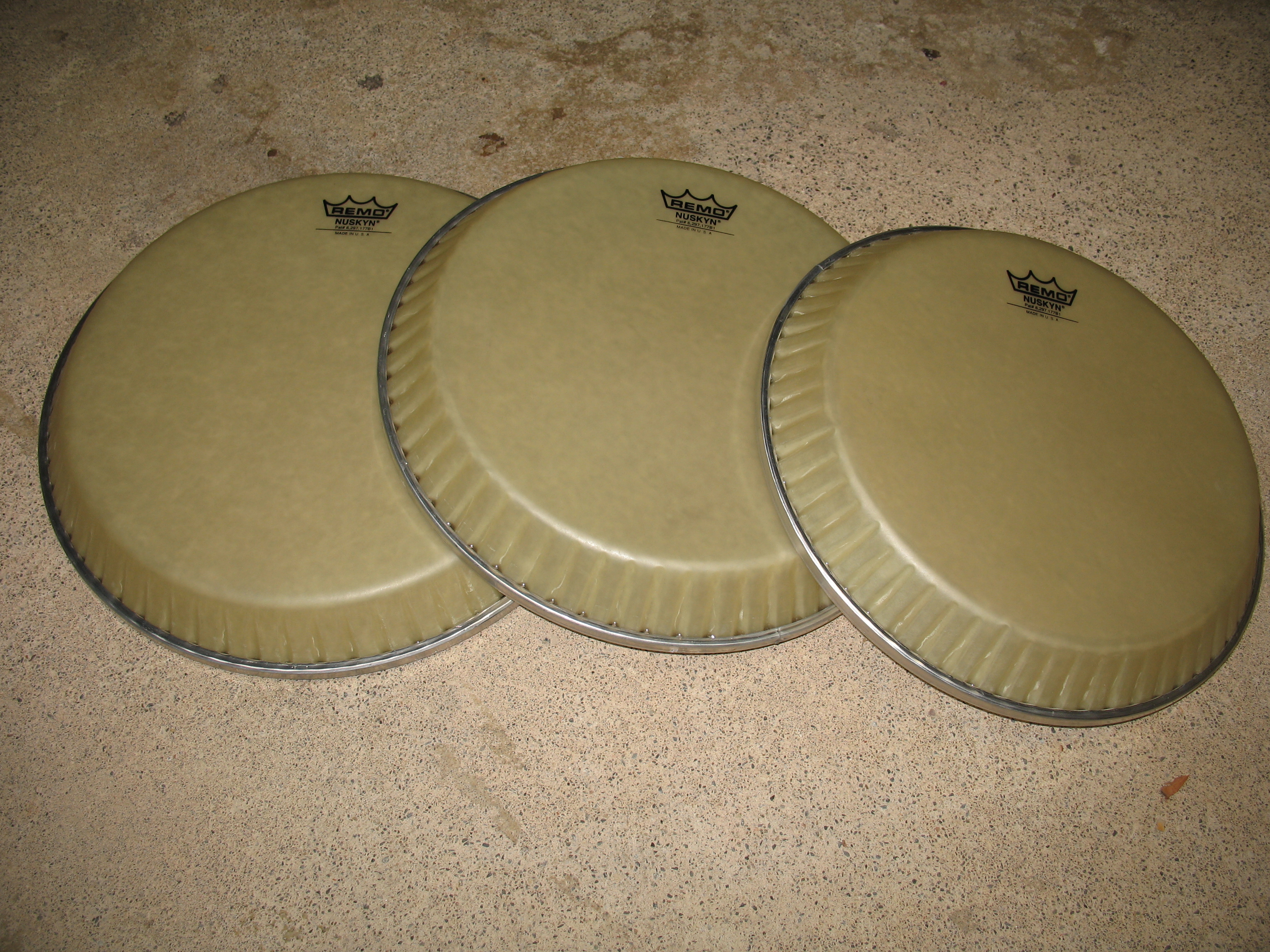 Tried the Remo Nuskyn " Crimplock Symmetry " on my Luis Conte Meinl's but wasn't happy how they fit on one drum.....it was OK, but not perfect. I'll just put the original skin heads back on for now.