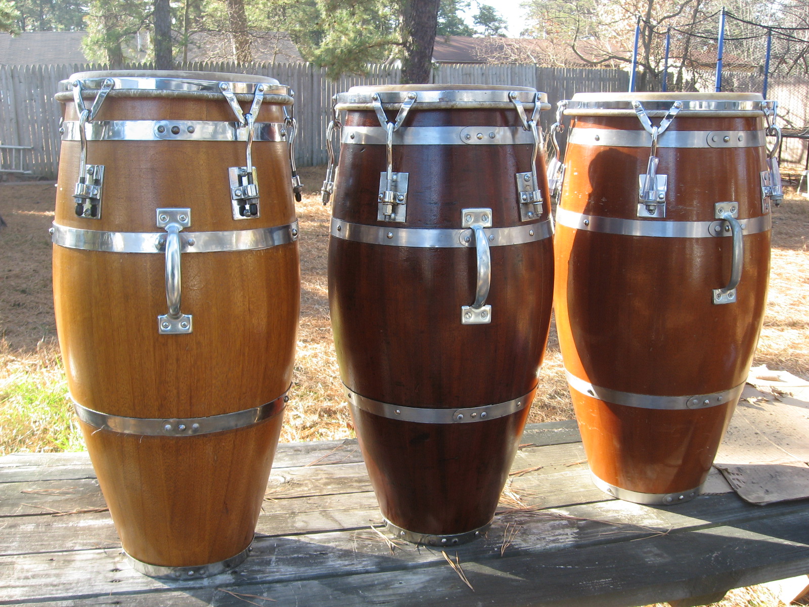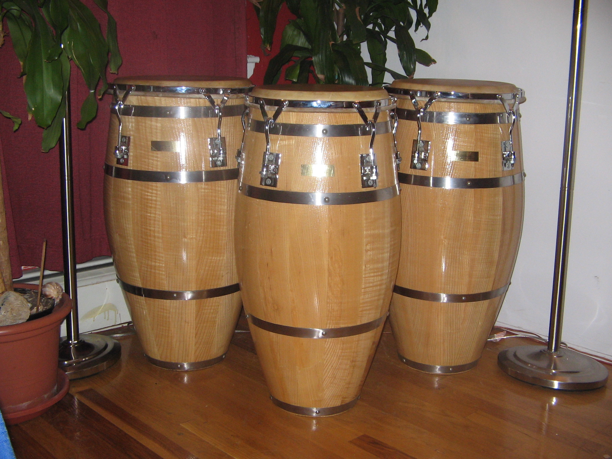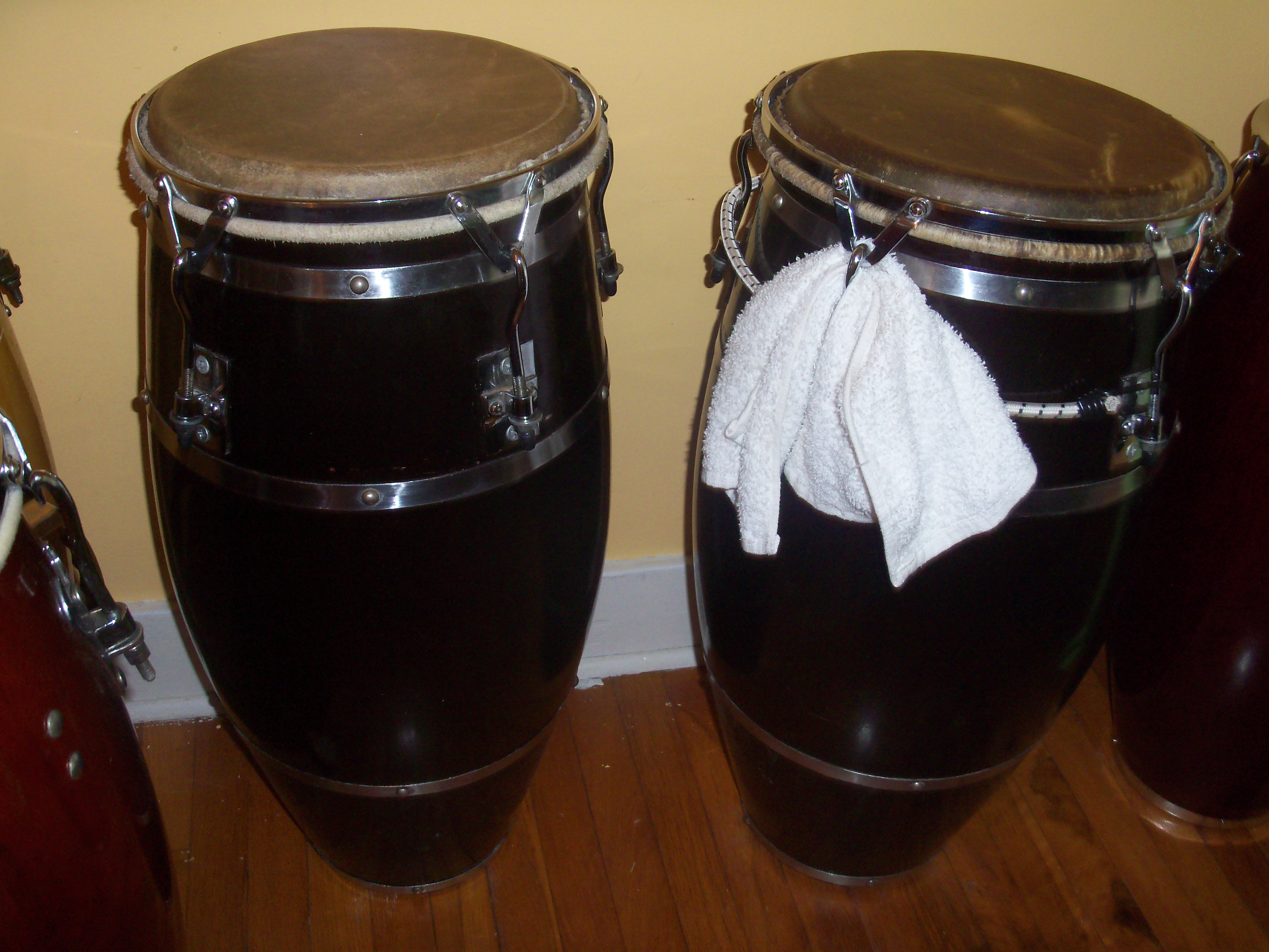 First my current set, macho 11 3/4, hembra 13" made in Dec. 1999 before the Y2K. Second, beat up Juniors I bought in a pawn shop in the Bronx, Junior had already passed, had Matt Smith refurbish them. SOLD them, but I could kill my self for doing it, circa 1968/69. Third Iya I bought a Junior's apartment, it was Julito Collazo's at one point in time. Fourth I nice pair I sold on Ebay plus the bongos that I still have.