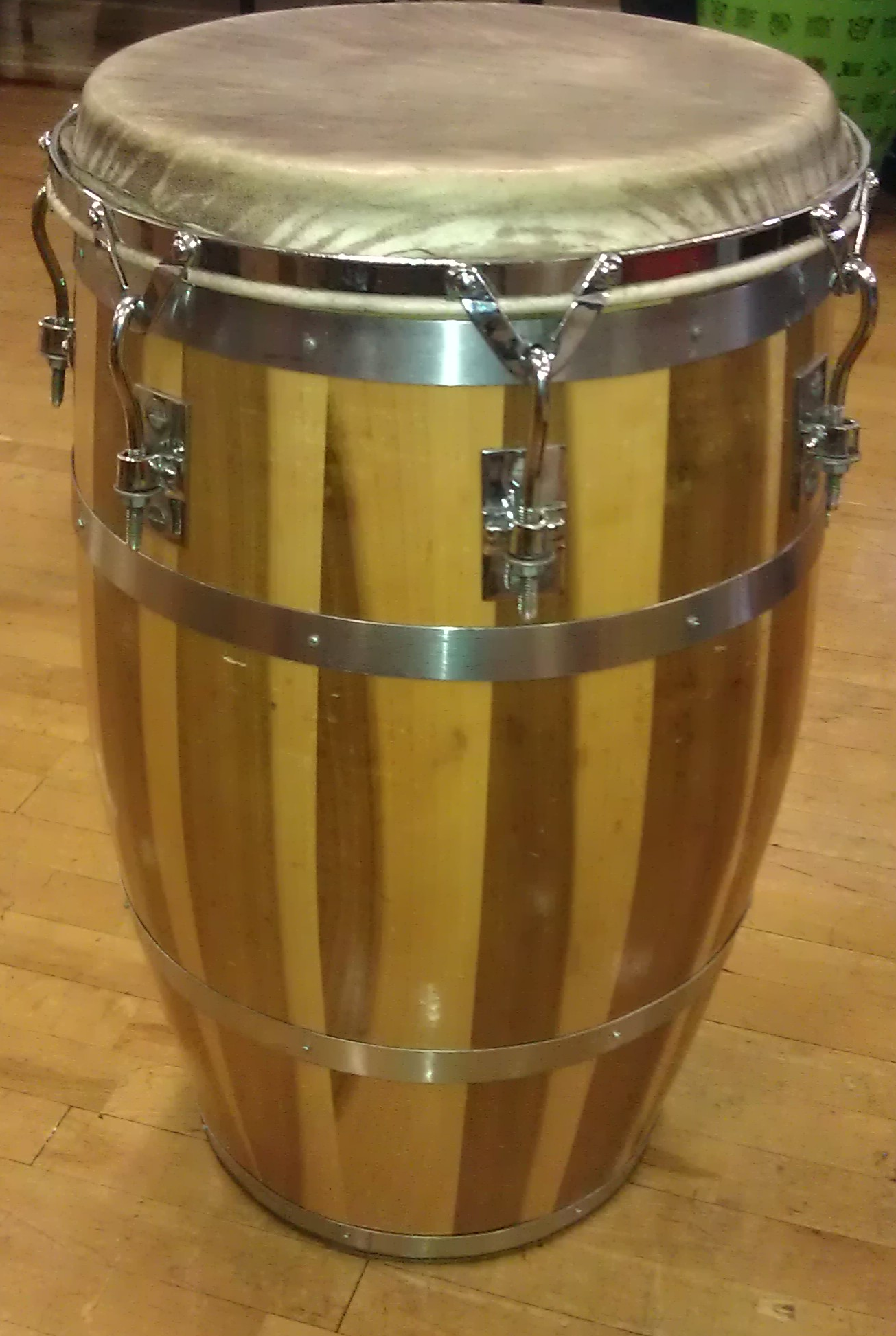 This is my oldest Junior Tirado its made from a Oak barrel and is number FIVE (5) as numbered inside drum in Chaulk. I had heard of these fabled drums and was lucky enough to come across one I grabed it without hesitation. It had been sitting in a basement in Brooklyn covered in grime her belly full of cobwebs and spiders wrong hooks and someone butchered the crown. The chrome came back with polish, the old crown has been replaced by a SOS steel crown, the wood cleaned up well. I mounted a black mule skin I had from Cali at JCR and she sang for me, her 12 inch head gives me tones that are rich and flavor filled. Her big Belly resonates with a great bass and yet I can tune her up para Tumbar. She is a very rare jem and every time I go to Brooklyn to my old Nieghborhood I ask all my friends if any one knows who has old drums for sale could you imagine another basement with more like this. The bands are also recycled from the barrel and are original to the drum. Double click on photo for a closer look