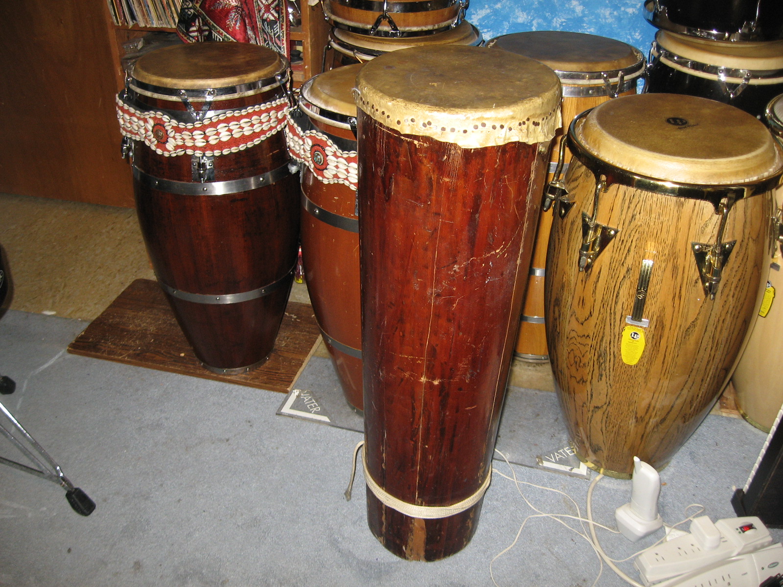 First let me say I know its not a conga but as most views and post are in this area I am hoping for the most attention here. I was given an old drum by a friend he says he has another for me that he will give me next Sunday and that its more like a traditional conga and he thinks it came from Cuba, cant wait to see it and get my hands on it. But back to the subject at hand, it may be a Makuta drum or Yuka drum (with out face), or the type used by the Carabali. There is a photo at the Cabildo in Trinida en Cuba and a similar type drum is at the Altar. The wood looks like cedro the head appears cow and is tacked on in the old way it needs restoration or I may leave as is as to not destroy historical value.Its about 36 inches tall and the head is about 11 inches It has an old rope secured around the bottom. It appears pretty old and played well, the skin is old and try. Thanks guys and girls. If you double click on the photo it will enlarge.