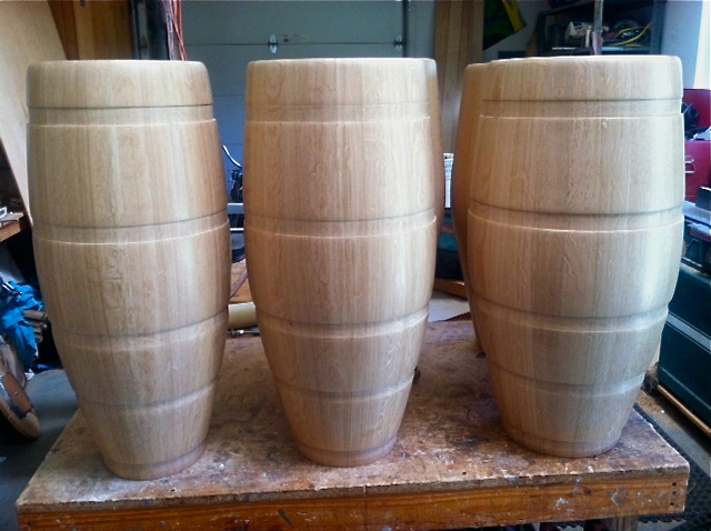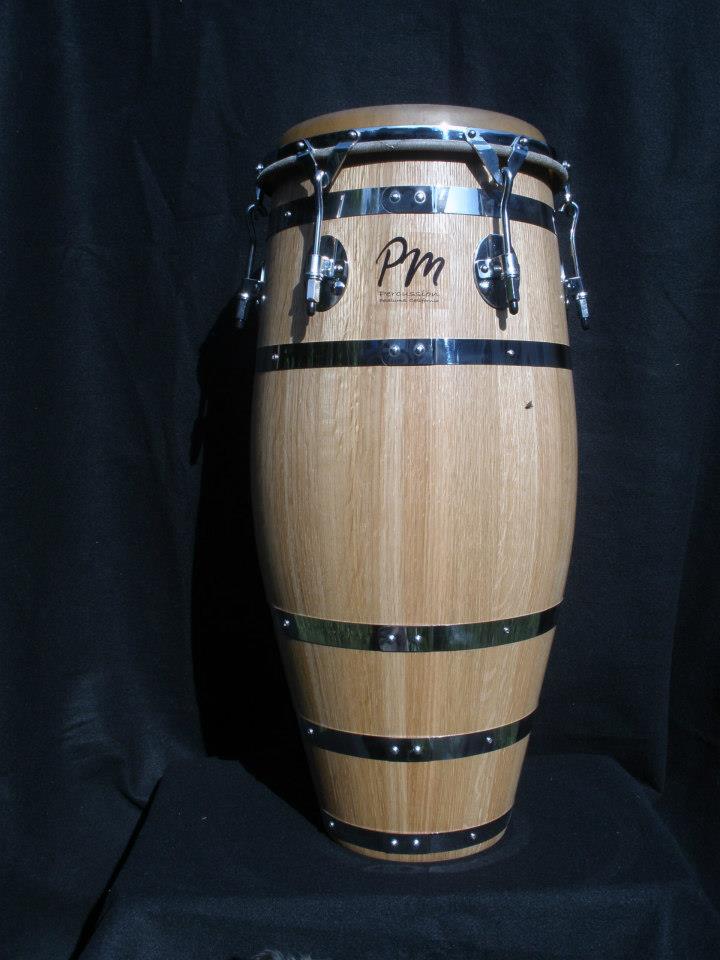 Here are photos of a custom one of a kind drum order of PM Percussion Cuban Tribute Series congas (in progress being made) with the bands embedded (sunken in) as well as a photo of the normal style Tribute series conga with the bands on the outside and another Cuban Tribute with no bands. I have also included a photo of a Pepperwood drum Peter made which reminds me a little bit of a Volcano Percussion congas.