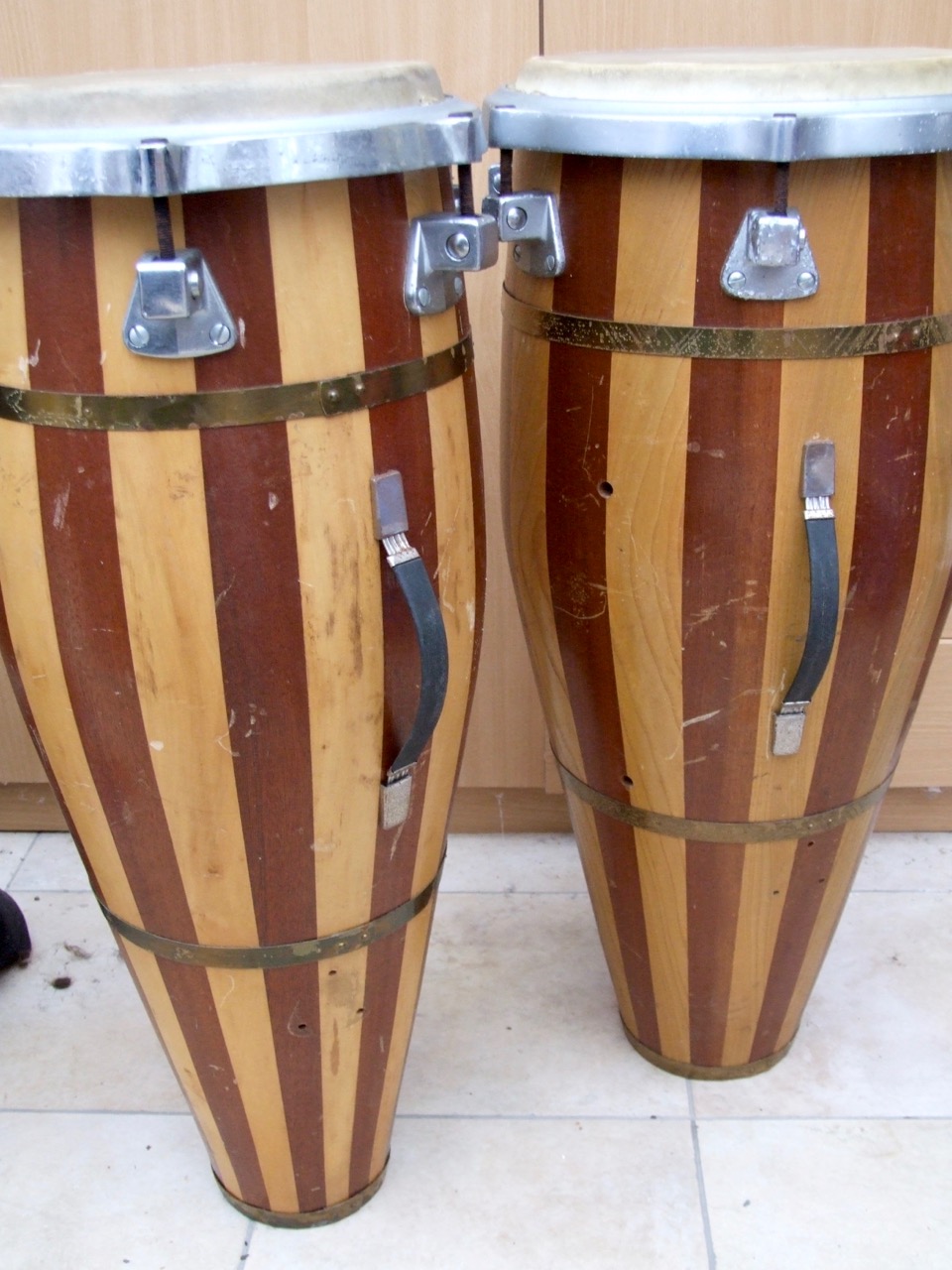 Hi all, I just bought these old beauties, as I gather, they are Italian, probably from the 70´ties. They are "Hollywood By Meazzi" - just under 32 inches high, and 10" & 11,5". Anyone with more info on these ? tips for restoring them ? The skins look fine, no cracks, and they actually sound very decent.