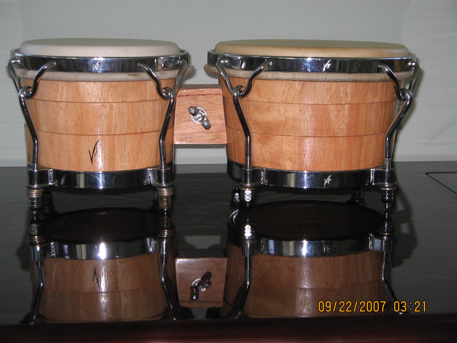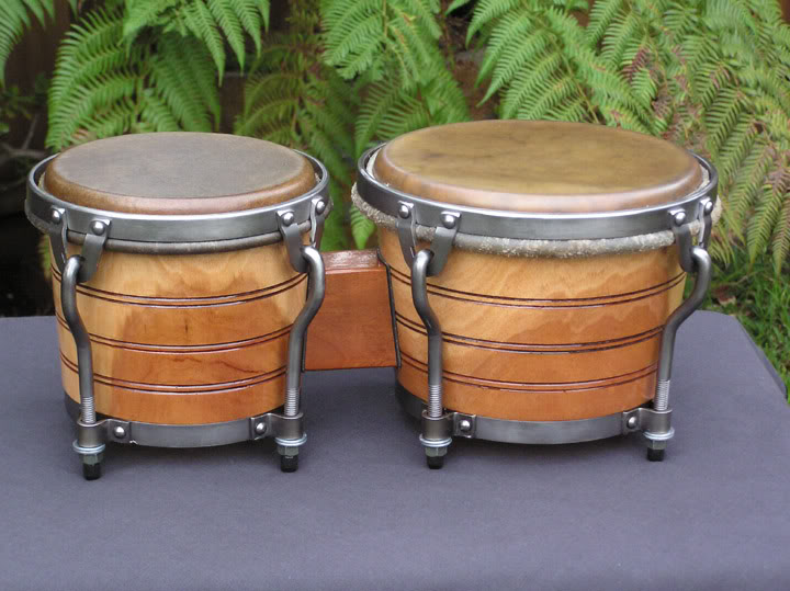 These two sets of bongos posted from a previous thead on this forum will be heading my way Mid 2011. Although I would have loved to purchase a new solid hardwood body set it seems tough to locate one nowadays unless a proper connection has been established with the right Artisan. Stave bongos crafted meticulously, correctly and with proper care will last long enough to hand down to family members or if the price is handsome enough a sellable item way down the road. The two attachments are of a Bloodwood Valje set from Mr.Ralph Flores at Resoulution Drums with calf skin heads (not the bleached heads you see in the photo) and the second will be an SOS black walnut set from Mr. Jay Bereck. Both very reputable, very polite and fine gentlemen. Long live their craftsmanship and beautiful works. P.S. Two views of my other fine instrument I own: the John"Dandy"Rodriguez Legends Series Bongo from LP.