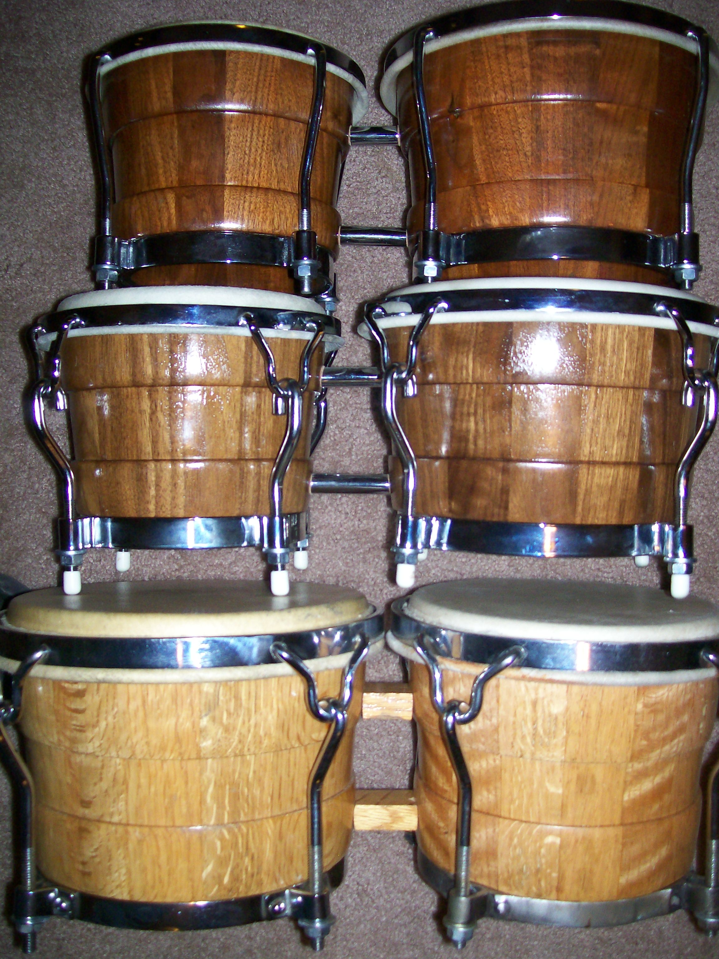 I felt like posting some pictures today. Here are all the bongos I own right now. A 30 year old Valje bongo. A 2 1/2 year old Resolution bongo I ordered from Ralph at Resolution and a Skin on Skin cherry bongo I bought used a couple of months back, made around 18 months ago.
