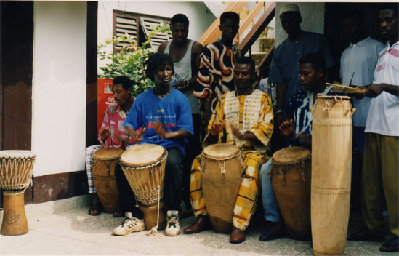 Here's a couple of pics showing at least one drum in the ensemble being played with sticks. I took these photos when I was studying and hanging out with this group from Ghana.