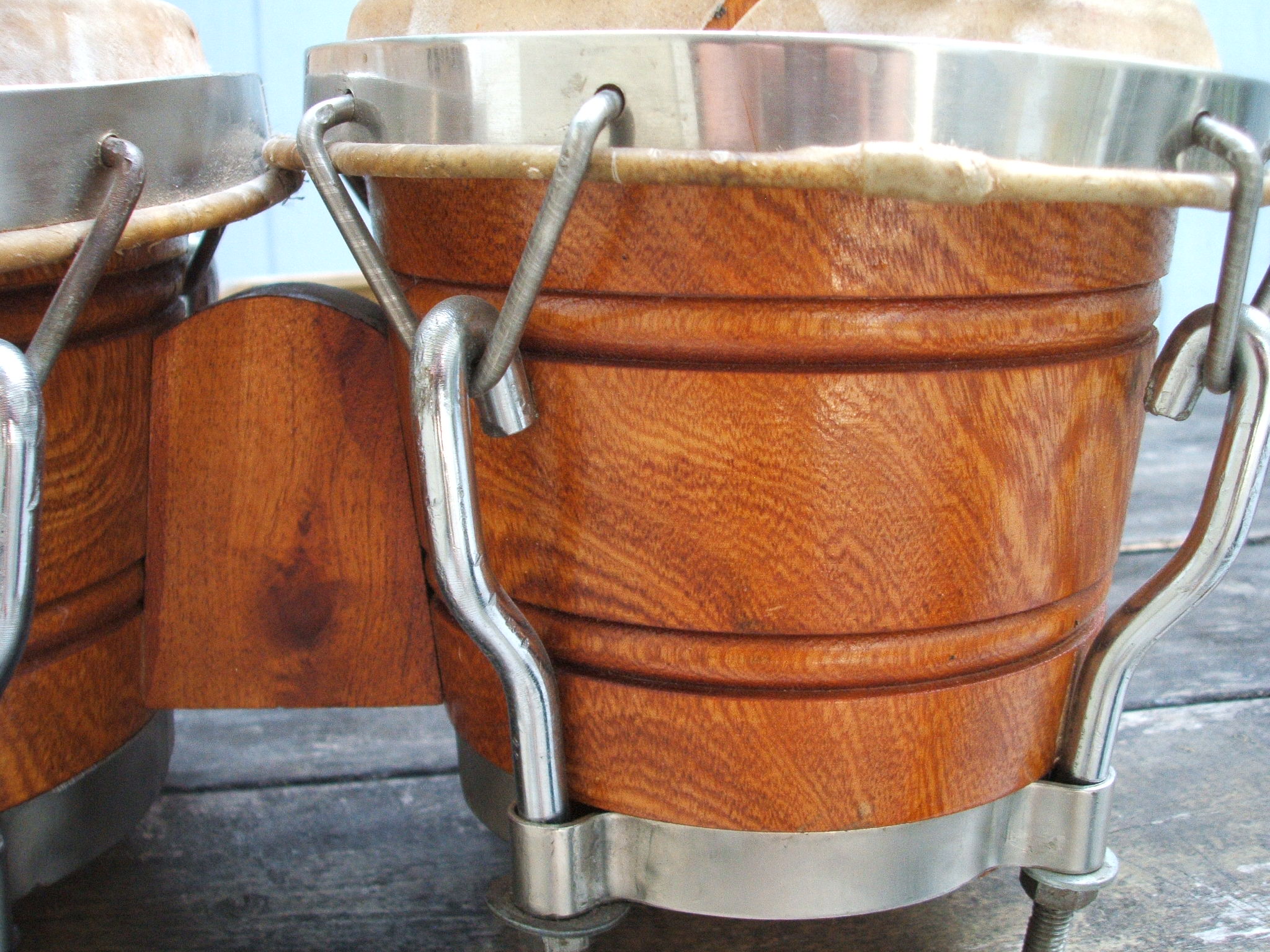 Just picked up these solid shell bongos made in Cuba. As you can see the hardware is junk, but the shells seem pretty good. I welcome any help identifying the wood and the maker of the drums. The drums are pretty light, no doubt partly due the the lame hardware. The macho is 6" and the hembra is 7 1/2". Anyways, it's been a while since I've had a drum project. Tinkering with old drums is almost as fun as playing them.