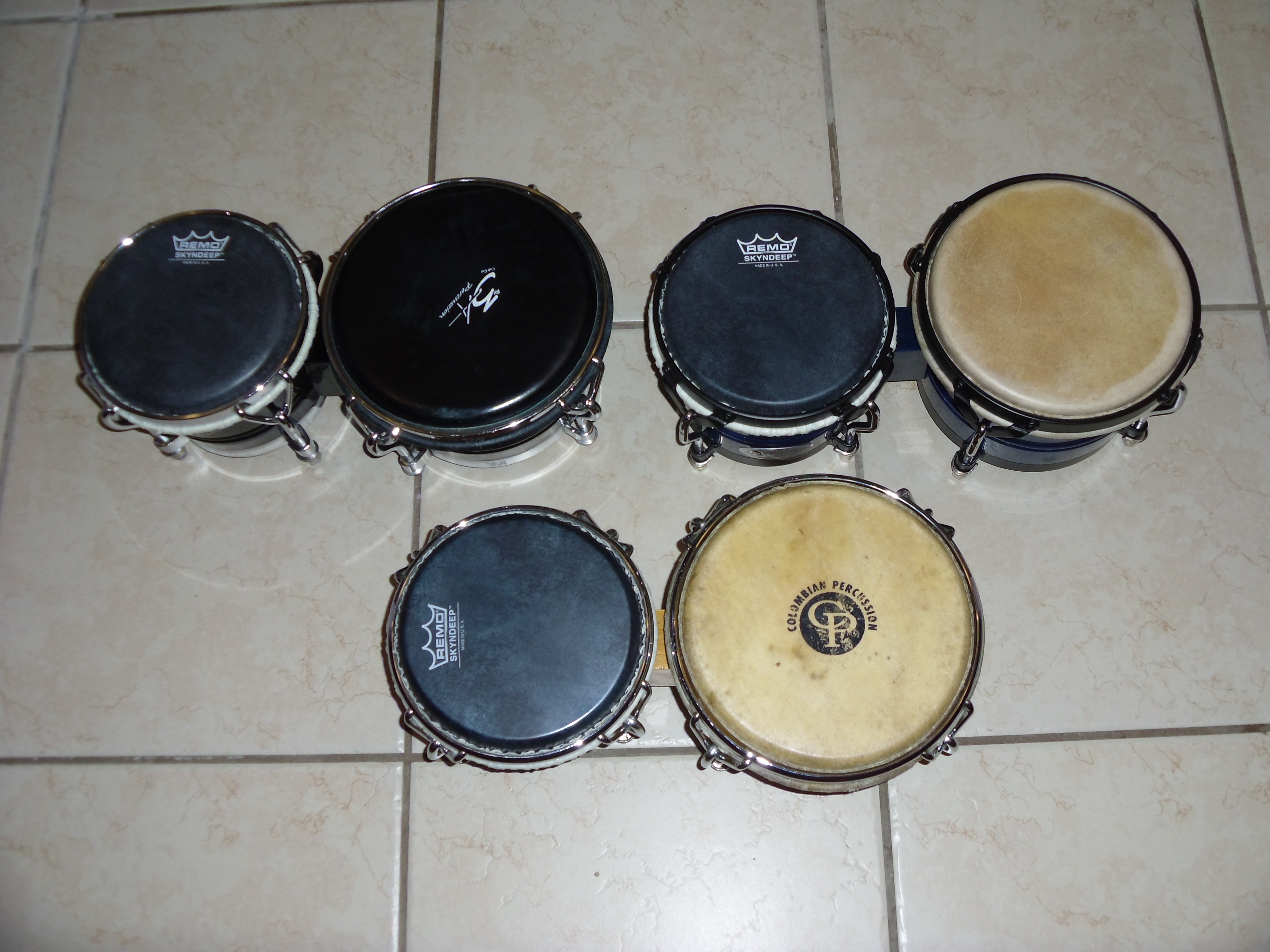 Thank you for the information. Percussion source is a website I buy often from, their prices are excellent. Knowing what the price of the newest style Remo heads makes the choice more attractive than Guitar Center's current pricing. I totally agree that the way the tucked style heads are fabricated. They produce a very dry sound, are very durable and quite an exceptional replacement for the natural rawhide heads. In addition it's good to have some peace of mind of not stretching the head out of tune and the longevity aspect of the synthetic head. The only problem I foresee with synthetic heads are the layers of laminates which are prone to wearing out and may show signs of flaking in some areas due to constant playing around the bearing edges where the fingertips strike the heads rather frequently. I like your color scheme choice of the PR flag graphic on the Macho with the black calfskin graphic on the Hembra, nice contrast. Did you happen to glance at the new color of bongos Adolpho Rocha's company is currently selling? I posted a picture below and may inquire about the possibility of a purchase from  him for this set next year. Gracias para la ayuda y Que Dios te Bendigas siempre.......