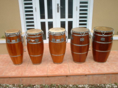 Hi there, I'm posting some of my Timbas Ismael drums 5 in total made of Puertorican Mahoganny and Stainless steel braces rims back plates and clamps,they were made to last .The Super tumbas were found in a humble country home near my town .They were used as table stands with a wooden door on top as a dinning table, covered with a table cloth or mantel. Some of these drums were made in the 1970's or probably earlier the sizes 11" 113/4" 12" 13" 14" . Two of these drums the 11" and 12" have a different type of rims I believe newer than the others original skins with Ismaels stamps.these two dont have the alma rims .I guess not needed for these sizes and use at the time, never used on gigs used on a christian church chorus band. Noticeably detail is the Lp handles original custom ordered,these other drums were bought from original owner.I hope you appreciate and understand that Puerto Rico is been the main, I repeat the main , stem of the african musical and cultural tree to the planet . Africa is the Root and Puerto Rico the flower. My respects to latin america and antillas. These drums can speak for themselves they were made to last and for the future ,my duty is to restore, preserve and pass it on. Thank you very much ,Timba pa ti.