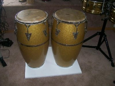 http://s1192.photobucket.com/albums/aa330/starbrite2/?action=view¤t=CarlosPatataValdez.jpg They are a set of three vintage 1978 white LP fiberglass congas hand-crafted in Palisades Parks, New Jersey, USA (11" Quinto, 11"3/4 Conga and 12"1/2 Tumbadora each are 28.5 inches tall). I bought them new in 1978 and these drums are clean and all the original hardware is pristine and free of corrosion. Each drum comes with the original emblem marked by Martin Cohen, the founder of Latin Percussion. Each piece of hardware is stamped with the LP insignia and has been recently cleaned and oiled. The set has three new synthetic Evans heads which offer incredible durability, weather resistant and tuning stability. The only slight imperfections are some very small scuff marks around the lug area due to the vintage style tuning system of bolts and washers. As you can see on the photos the wear and tear is minimal. These drums are in spectacular condition considering their age.