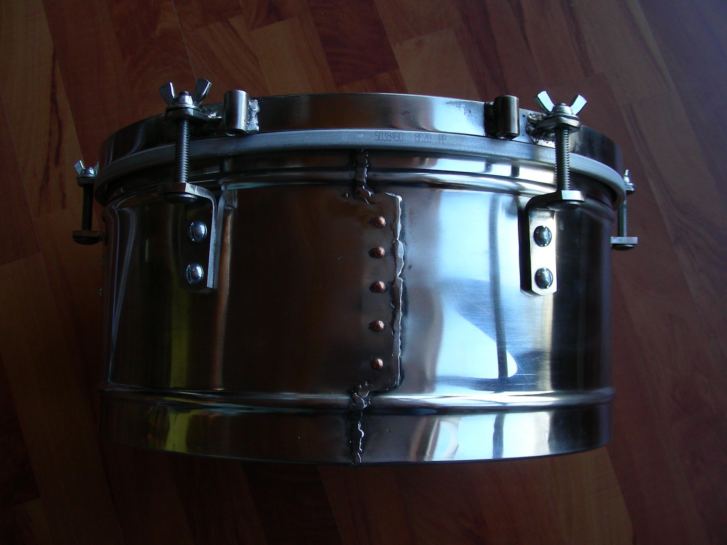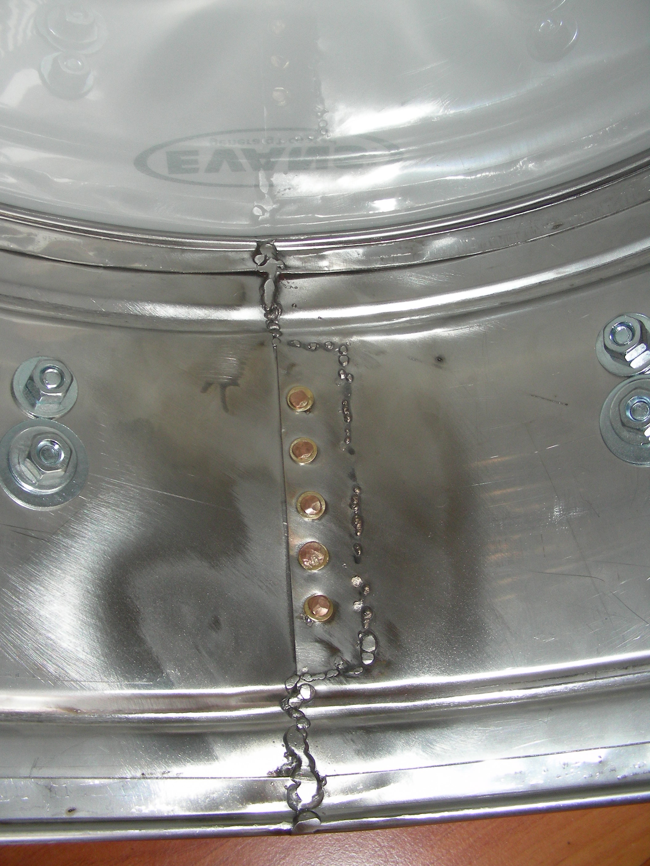 Anyone consider the possiblity that an ugly weld MIGHT contribute to a drier sound? In the automotive world, a steel crankshaft that is not cracked will ring like a bell when tapped with a wrench. Yet a steel crankshaft that has a hairline crack will just go "dank" when struck. Slight imperfections break up the harmonics of the ringing. Perfect material allows the ringing to sound out nice and clear. Perhaps this might correlate to timbales, just a thought.