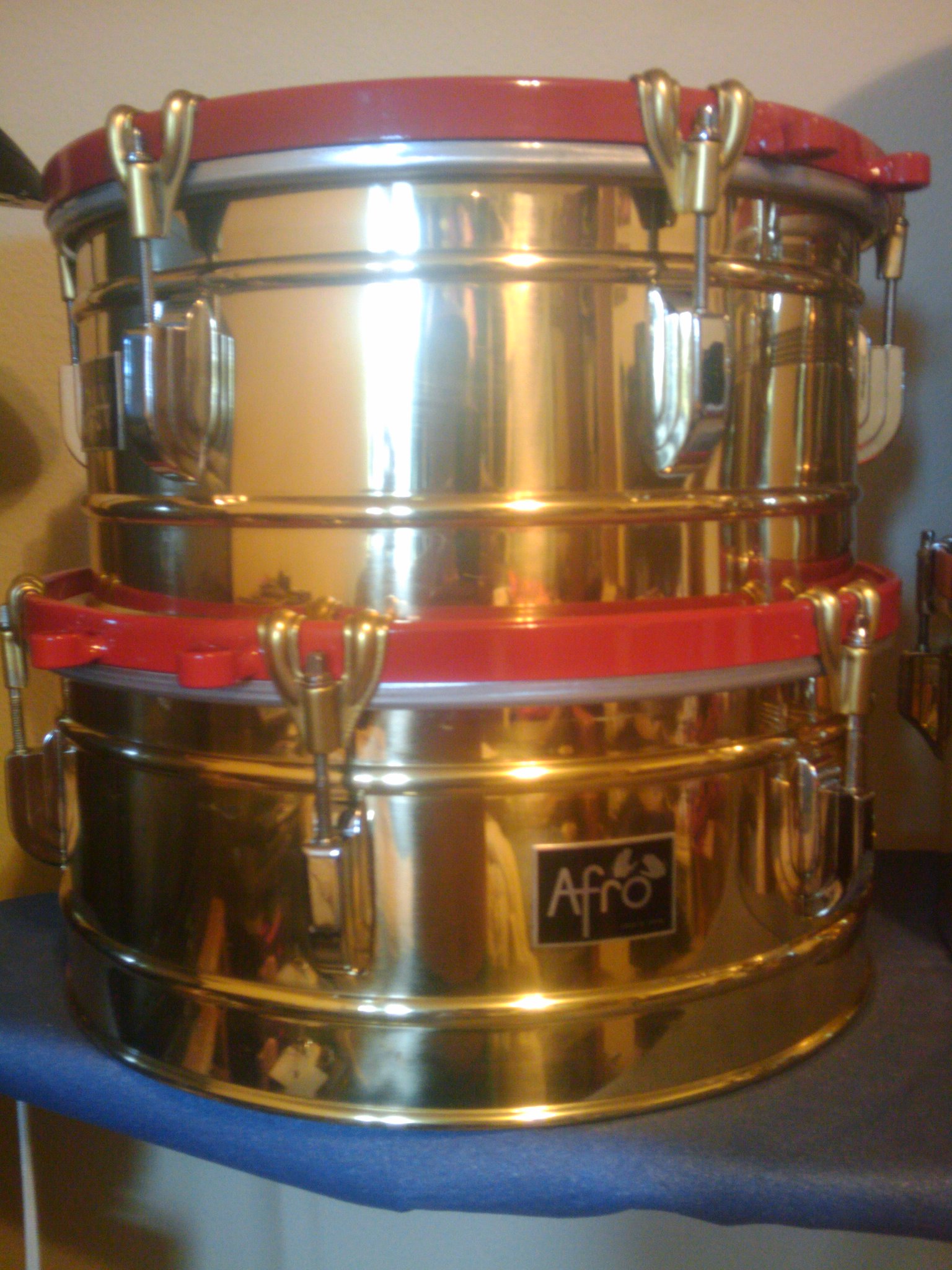 well, they must be a recent product ! Matadors historically were chromed or brass tinted steel shells. The finish coats may include these brushed finishes or paint schemes, but the cost of true brass shells are usualy more than even stainless steel shells. To test the shell...use a magnet. Real brass is non ferrous metal and not attractive to magnets. Btw...gold tinted hard wares are not GOLD. just tinted coatings over polished chrome and it wears off and oxidizes into a very ugly finish. Chrome is best, Stainless steel is best for anti oxidant but not for music tonality. Real Brass comes in various thicknesses and various alloys w/ tin etc added. Bronze is brass w/ lots of tin etc to add strength but makes for ringy tones like chromed steel shells. Double check the so called brass shells you have. I doubt real brass is used on mid level matadors unless it is a new product not yet seen in West Coast stores. Real brass has been used & recycled since the bronze age. Most brass articles are in fact an alloy and the color is obvious. Brass is more expensive than steel or stainless steel & is too important to high end industries than to be affordable as for drums. Brass drums require more care if not chromed. Most drummers do not even care for the drums as is evident from the beat up pictures I often see and lack of articles & discussions on the subject. Good Luck...I hope you have real brass drums ! I would love to see Matadors in Real Brass so I can replace the tuning system and mountings for a more classic American tuning system like I did w/ these Afro Brass Shells in this picture below. My next project is to create the metal rollers and interior molds to shape my own shell design, location of ribs and sound edges for brass alloy shells as a happy medium between brass & steel shells w/ a tunable cascara tone. Once these tool machines are built for stronger steel & bronze shells, Brass shells will easily be possible. Enjoy ! This is something I'd have hoped Gon Bops would have done before putting the brand logo on the plain shells and Asian designed Lp copy tuning hard wares. At least I can still hope they will. If not...I hope to build build my own.