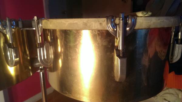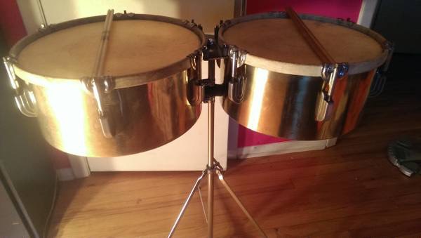 These are Leedy timbales, but probably from the era when Leedy belonged to the Slingerland company. I own a set like these, but mine have Leedy badges. Classic 13" and 14" brass shells and animal, probably calf, skins, traditionally wrapped around the rim.
