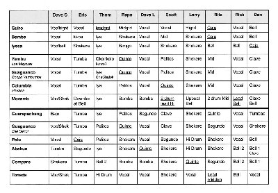 We're now focused on a gig at the Laughing Goat http://www.thelaughinggoat.com on either Saturday Jan. 24th or the 31st. Eric and I will be making song sheets for everyone that will include all of the songs we will sing that night inserted into a grid of clave or bell. This way everyone who comes can study up on where everything fits into the beat and exactly where every syllable overlaps. Rapa will be here from GA to thrill us on quinto, Dan will be gone to Hawaii and will be sorely missed. We're collecting Willow - lead singer from the old Caberet Diosa, Ritz who's back from New York loving his long forgotten roots with our group. We're contacting everyone who's played with us, so it should be a good show!