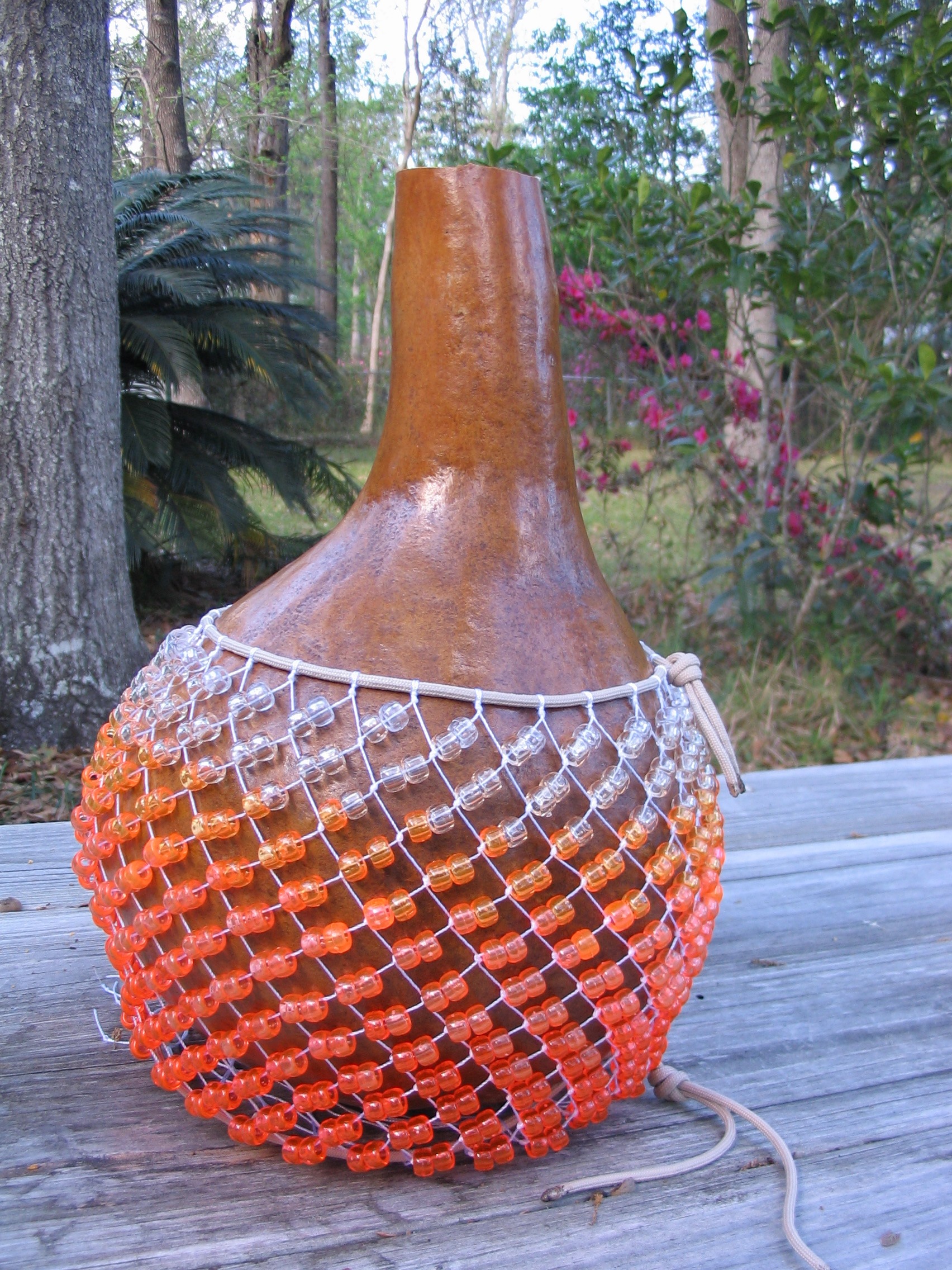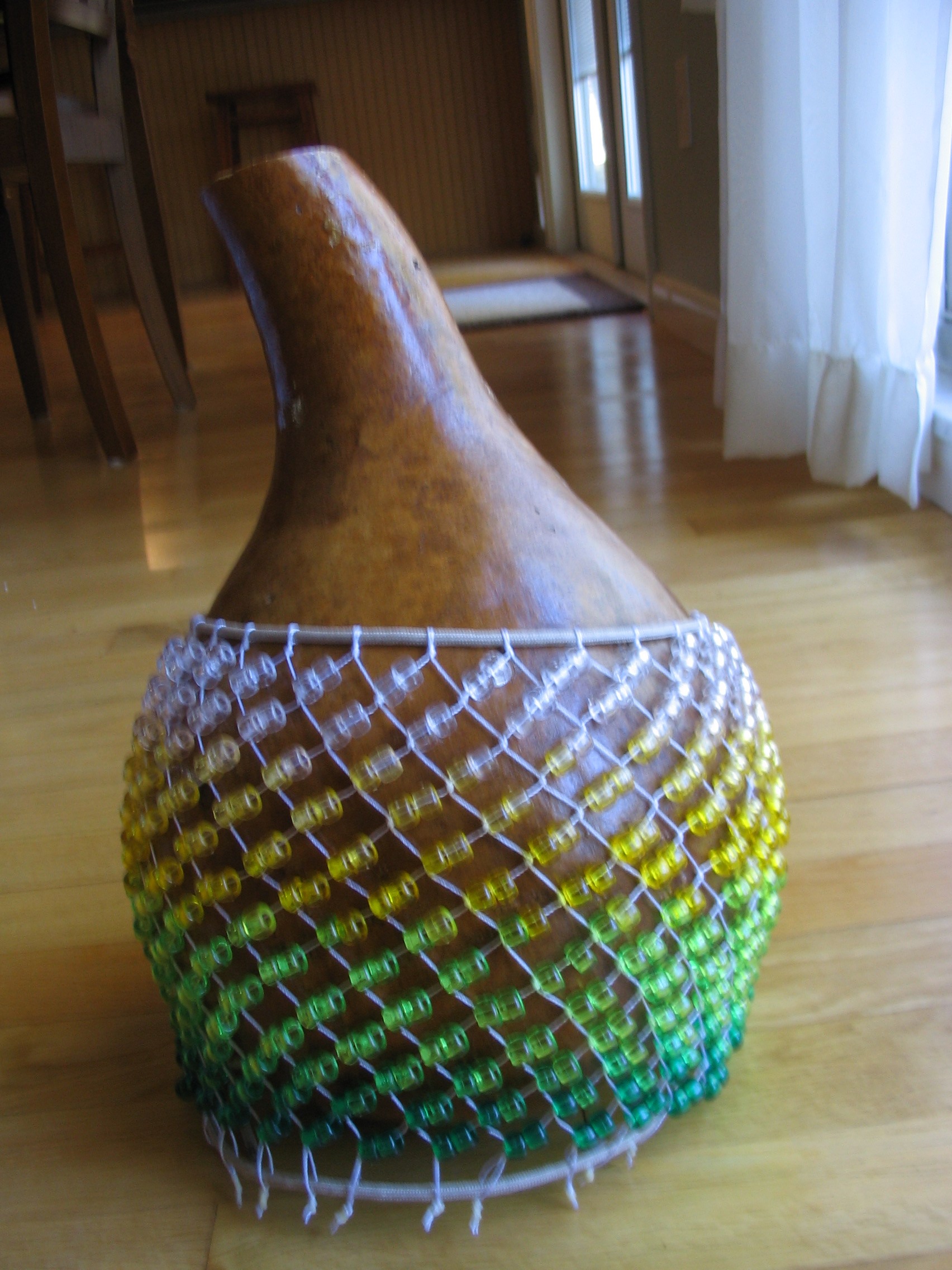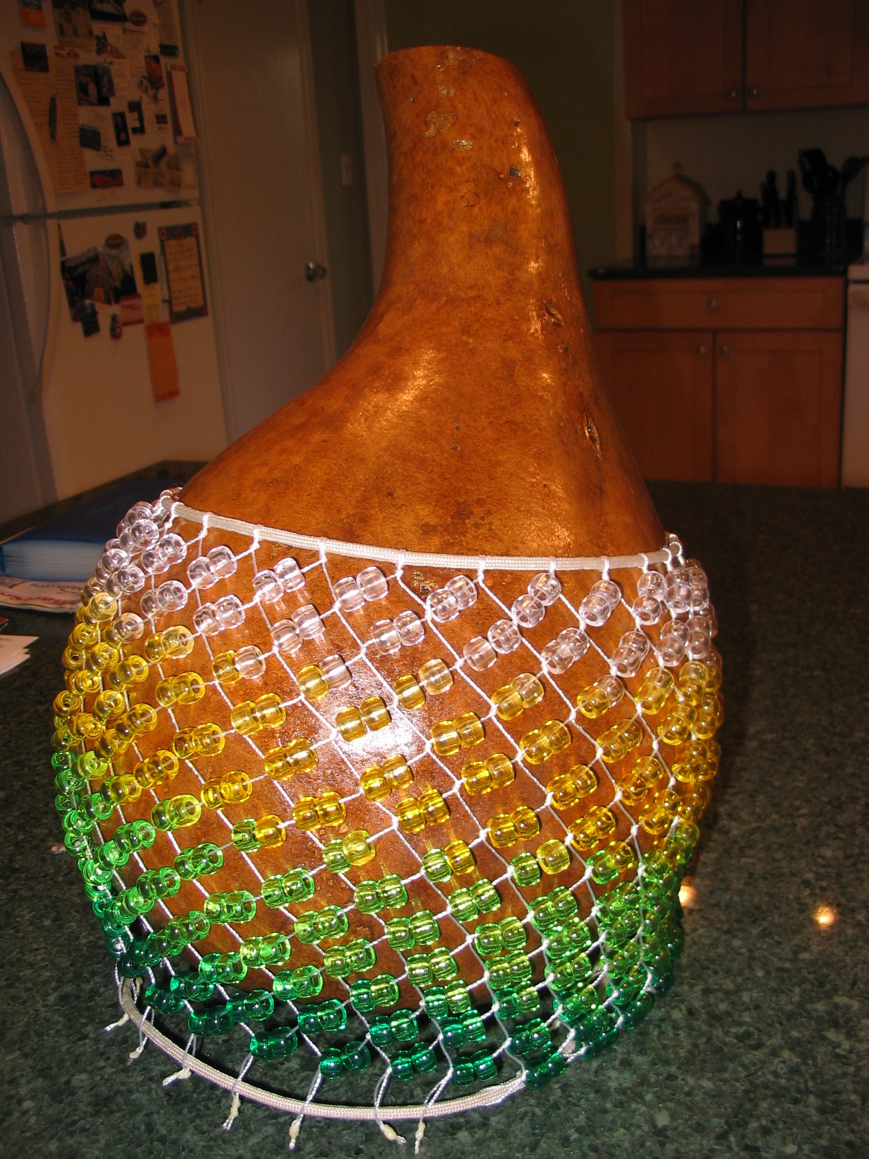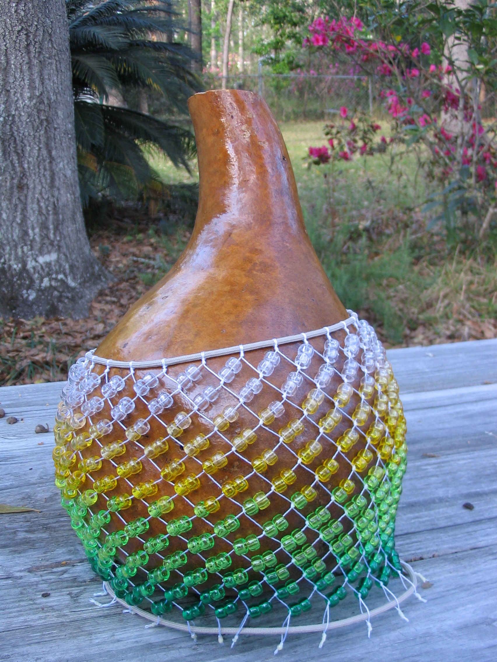 Rhythmrhyme: Also, thank you for you thoughts and concerns about Richard. I don't have anything ready to go at this time; just a stack of gourds that need to be stained, polyurethaned, and skirted. I'll send you a PM and we can discuss the details. I have some ideas for new color concepts, developing previous concepts with different colors, or if you have an idea then we could work on that. My costs are directly related to the materials used - larger gourds cost more and use more beads, etc. In other words, custom designs do not cost any more than any other designs.