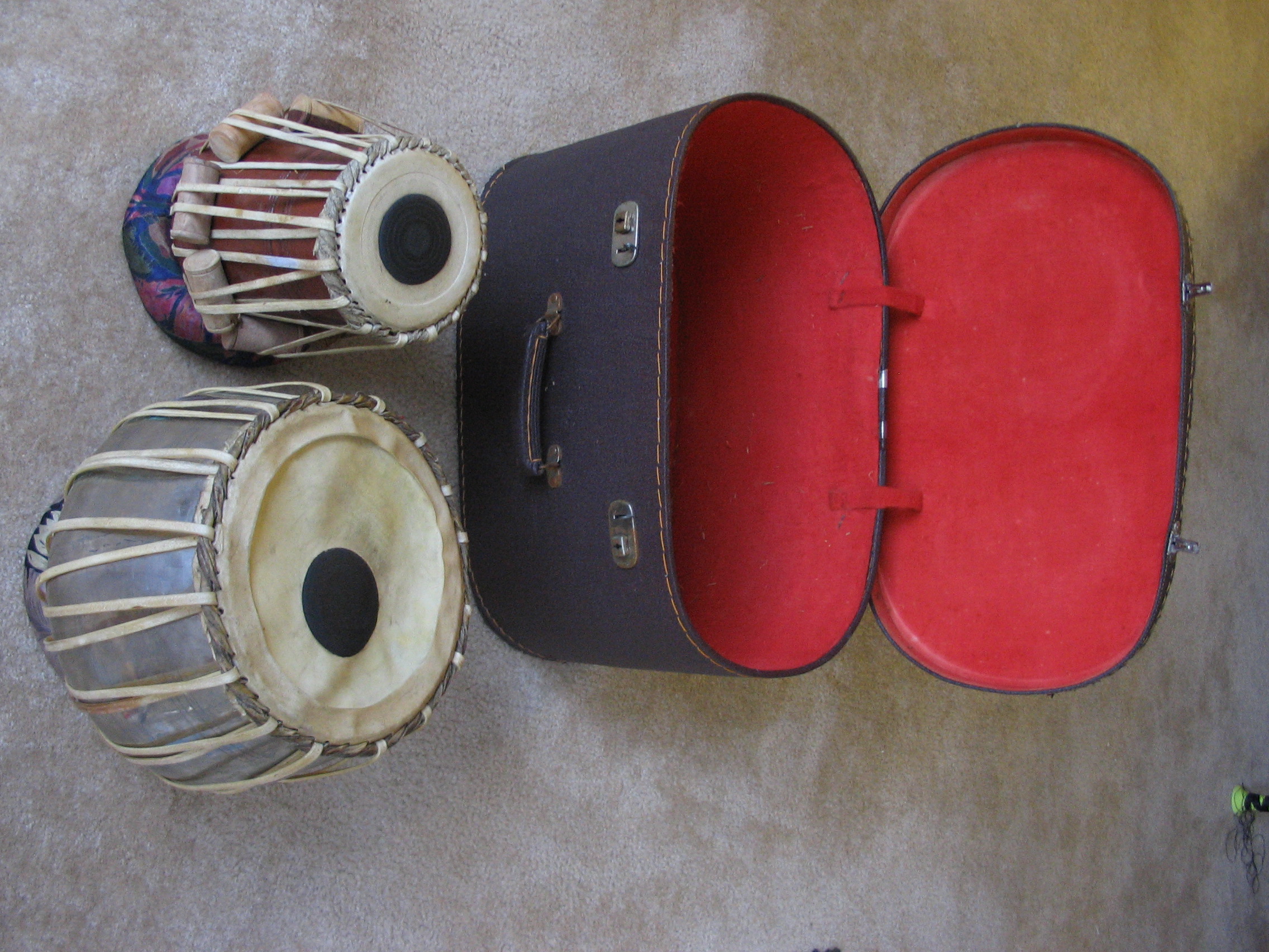 Tablas $100: Indian Tablas for sale! Price includes drums and rings. Case is included - it is functional but damaged so I'm not assigning any monetary value to the case (if you buy the drums, you will get the case for "free"). Goat skin heads with iron tar dots. Drums need to be tuned (I don't have a tuning hammer); larger drum is out of tune with a loose head. If you know how to tune tablas, then here is your chance to revive these instruments and give them new life in practice and performance. These are generally very expensive instruments (+$300); this is your chance to score them for a fraction of the cost.