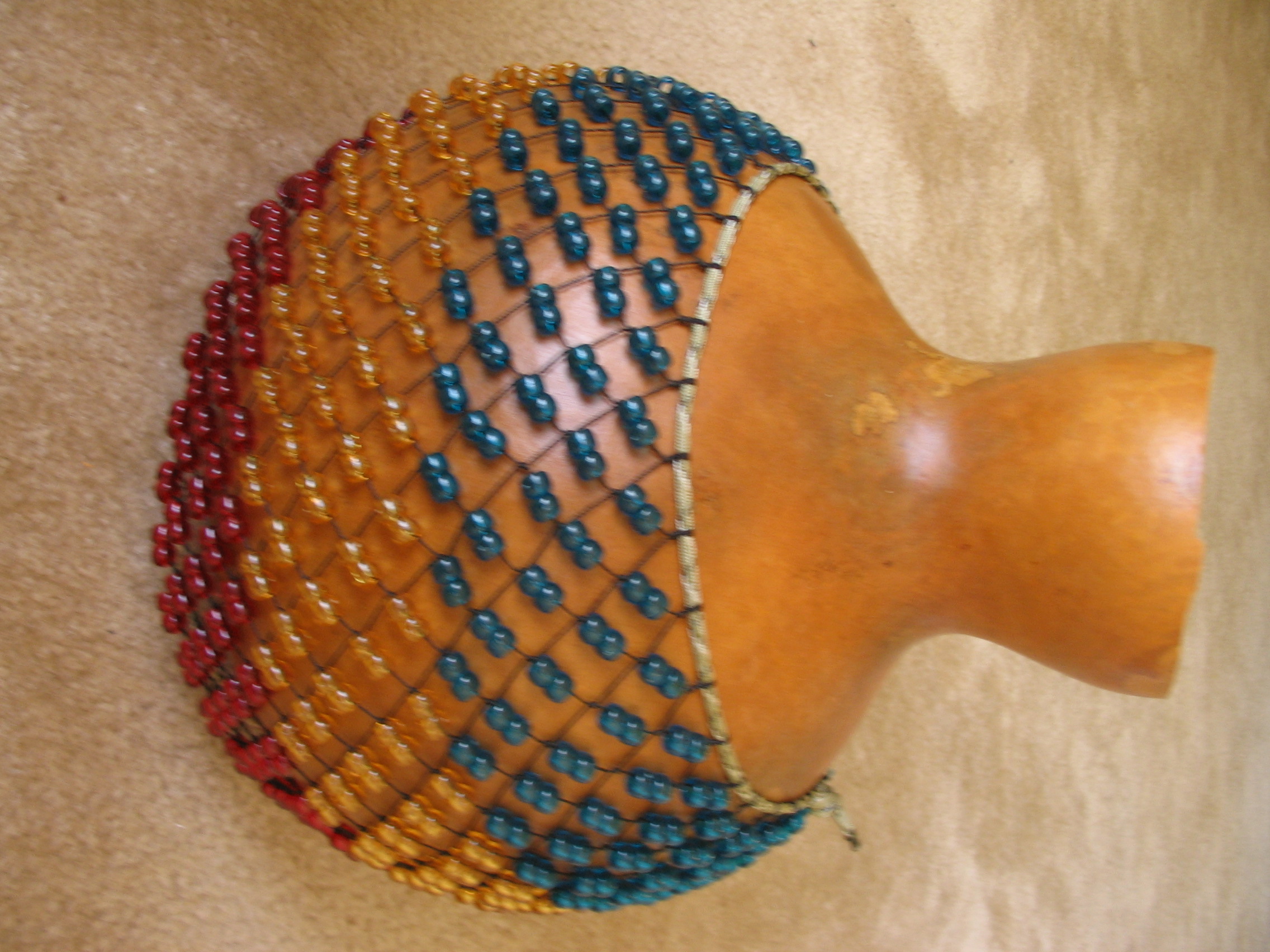 Custom Shekeres $119 (ea, price includes shipping for these): Made from very large gourds, these are "Sunburst" and "Reggae Shake". Gourds are dried, cut, cleaned, then a coat of polyurethane is applied for protection. Nets are custom made to each gourd. Current shekeres have over 1000 beads; gourds are larger than basketballs. Be seen and heard in your drum circle, band, or percussion ensemble with one of these! I've been making shekeres for over 20 years and am back in 2016 with some new instruments.
