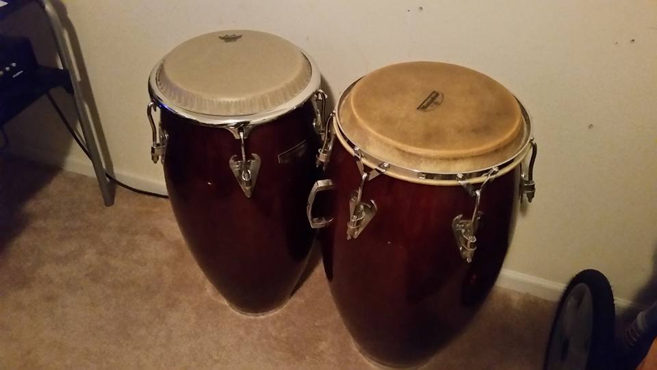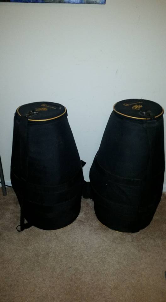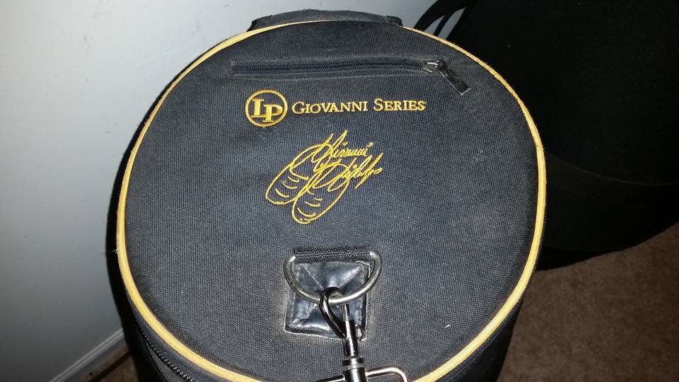 I have a set of LP Matador wooden congas. The tumba has the original matador skin, the Conga (I think it's Conga) has a synthetic remo NuSkyn head. Giovanni Bags are in decent shape. This set is used and has some dents / dings / scrapes on the finish but nothing major.