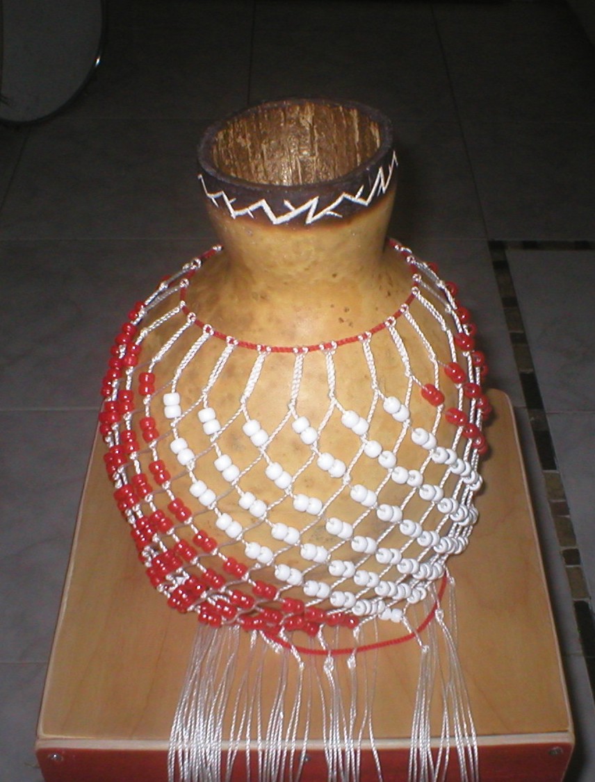 Nice medium size chekere , will not wear you out... I can also make you a custom nets to fit your existing gourd.. out of plastic or glass beads. or both . Various patterns and overall well crafted.