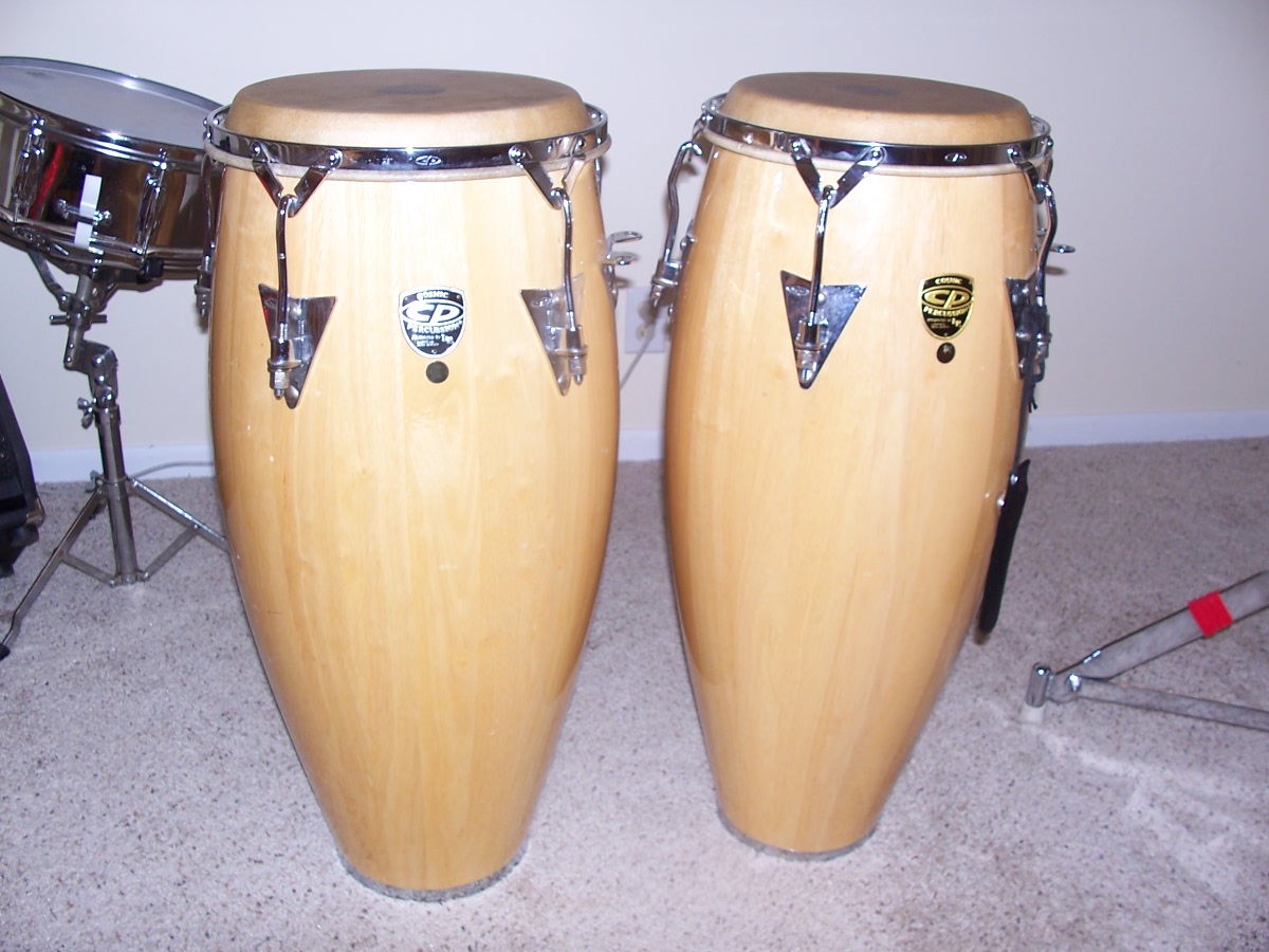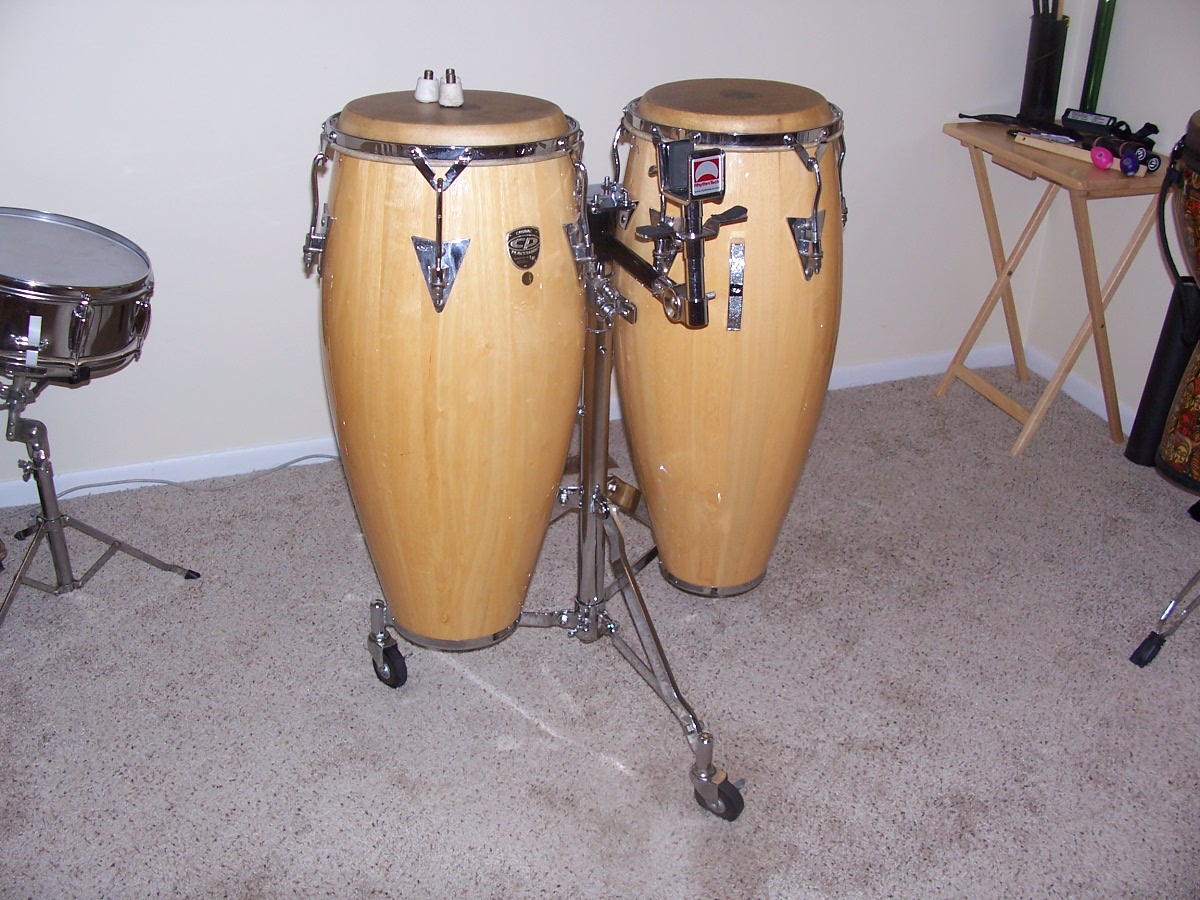 I bought these (requinto, quinto) in February and have used them weekly since and have been gig'd but transported carefully. They are in good condition with some usual scuffs and scrapes, but nothing that should alarm anyone. The heads seem good, they sound good. I'm making room for my new quinto/conga/tumba set and I expect to get them this week. I really don't anticipate a need for these, but they would make a collector a very good find of some pre-LP CPs. The stand is the LP 2 conga stand but I've fitted a bongo mount to it. Beware that the bongo mount works well for me to play 4 drums seated, but there is not a lot of adjustability for the bongos. They are something that I fabricated from a defective bongo stand that I ended up with and it is removable very easily. I can ship from 48917 and I'm willing to wrap the heck out of them to prevent damage, but the shipping cost will be added on to the price once I make a deal with someone, package them up, weigh them and then get a cost. My work is a manufacturing facility and we ship a truck load every day so we get a discount on fedex and UPS. The best price will be fedex. My price for the drums is firm at $90 each, and $75 for the stand. If you want a 3, then I'll knock off $10. I know, not much, but I don't need to tell you what they sell for at any of the internet retailers. I would really rather not break up the two congas, but the stand can be sold on CL so no problem if you don't want the stand. I have fixed feet for the stand that replace the castors so it won't roll around. They can be swapped out in a matter of minutes. If you are local, they can be seen and picked up in Owosso, MI. For this price, I can't meet you half way. BTW; what you see on top of the quinto are the fixed feet for the stand.
