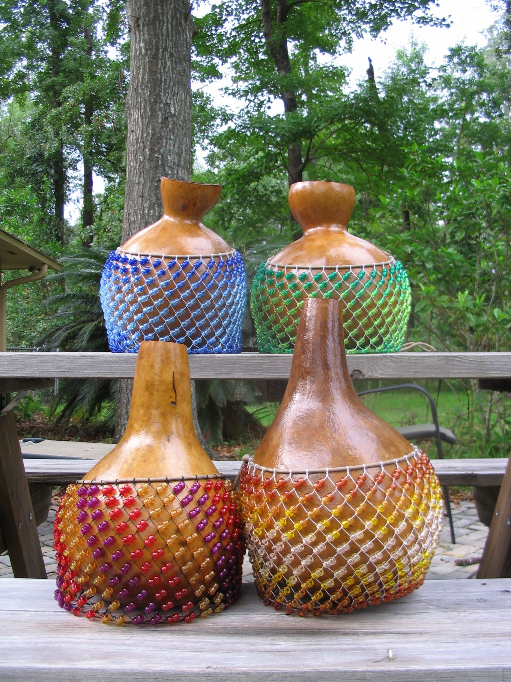 Light golden oak stain over solid gourd for a glowing color underneath transparent ruby red/deep purple/sun gold beads. There are 30 leads (from collar), 11 double-bead rows at 60 beads/row totalling 660 beads. Collar and hem made of strong nylon cord; net assembled from strong nylon twine. Materials selected for their strength and durability.
