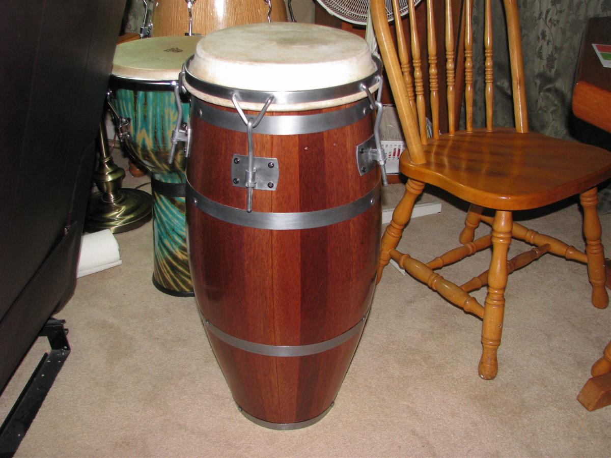 I repaired a split between the staves. The line you see is some of the sanded shavings from the original finish mixed with glue that I applied while bringing (squeezing/pressing) the staves together. This outside edge of where the staves meet show in this darker line because I sanded the edges a little before gluing. You can't feel it but you can see it - otherwise the drum is perfect and sounds awesome. I think it has the original head because there is a Gon Bops ink stamp on it. If you look into the drum from the bottom you can see it's a little out-fo-round. That does not seem to affect the tuning at all from what I have experienced. The drum was on consignment in a secondhand store in Winthrop Washington when I bought it. The former owner is from Hawaii and owned the drum for many years while living there before moving to Washington State.