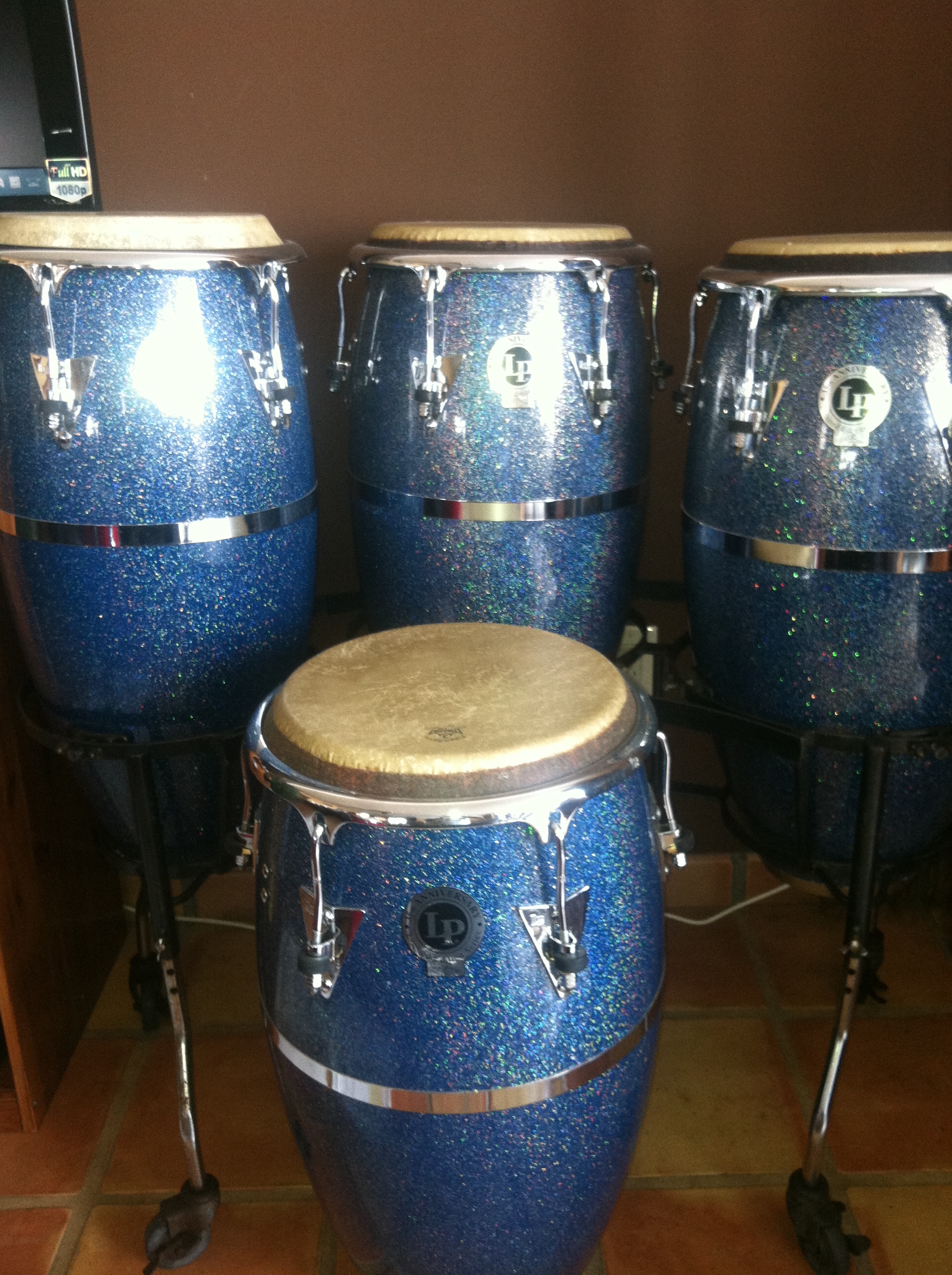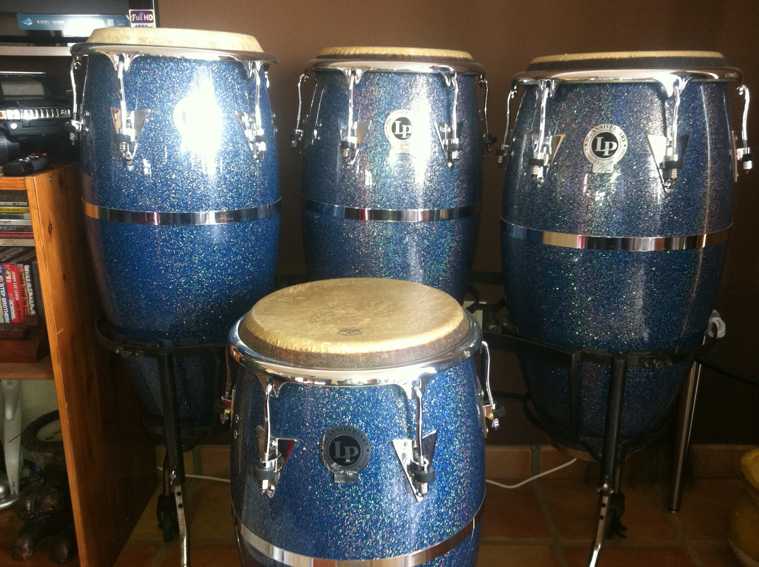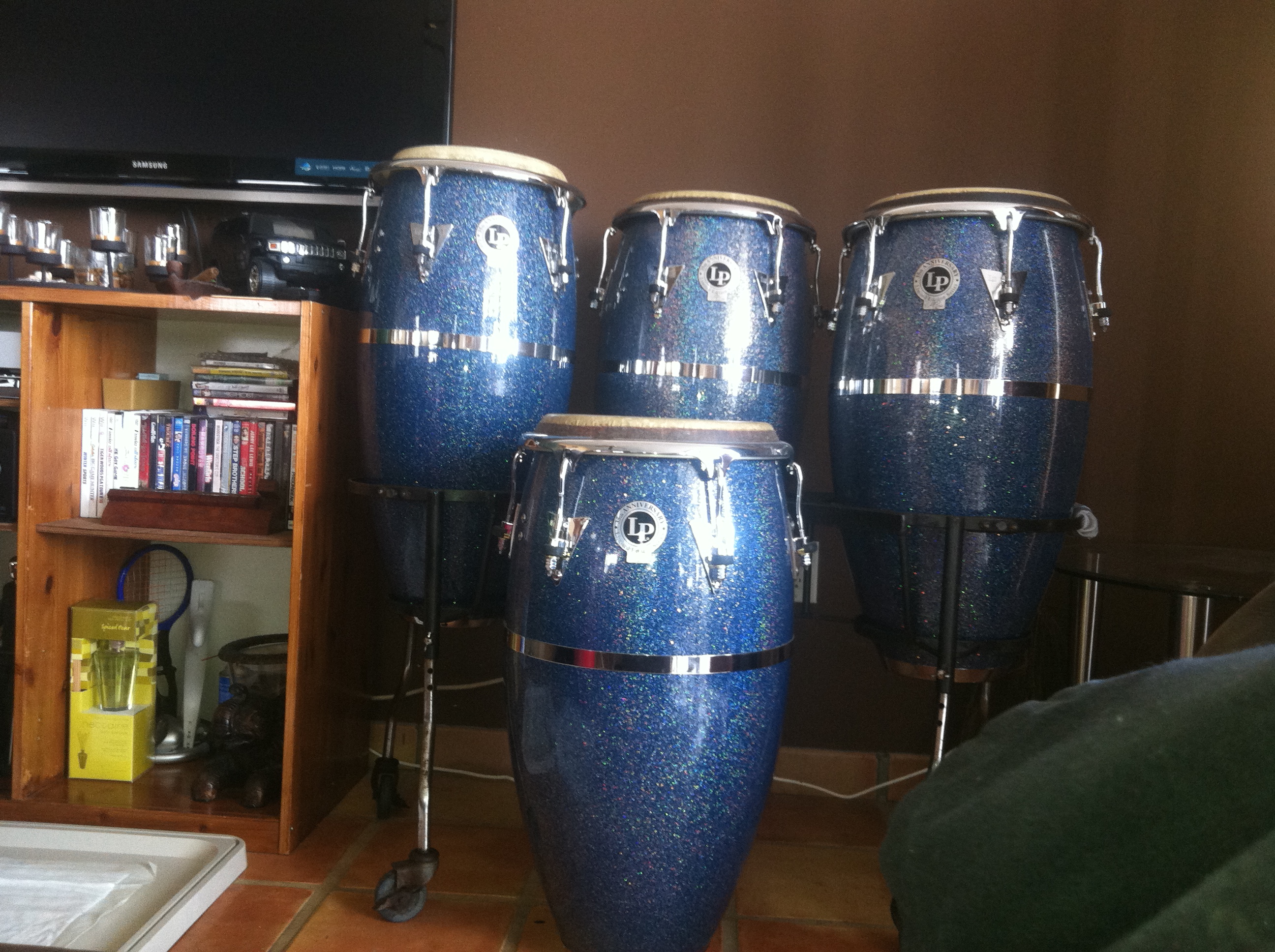 These four congas will give alot of stage presence to anyone wanting all four. It is alot of Kelvar! They consist of Quinto, Conga, and two Tumbas. The Quinto has a New LP hand Picked skin, the rest are dressed in Remo Fiberskyn. These are the equivalant to Galaxys.