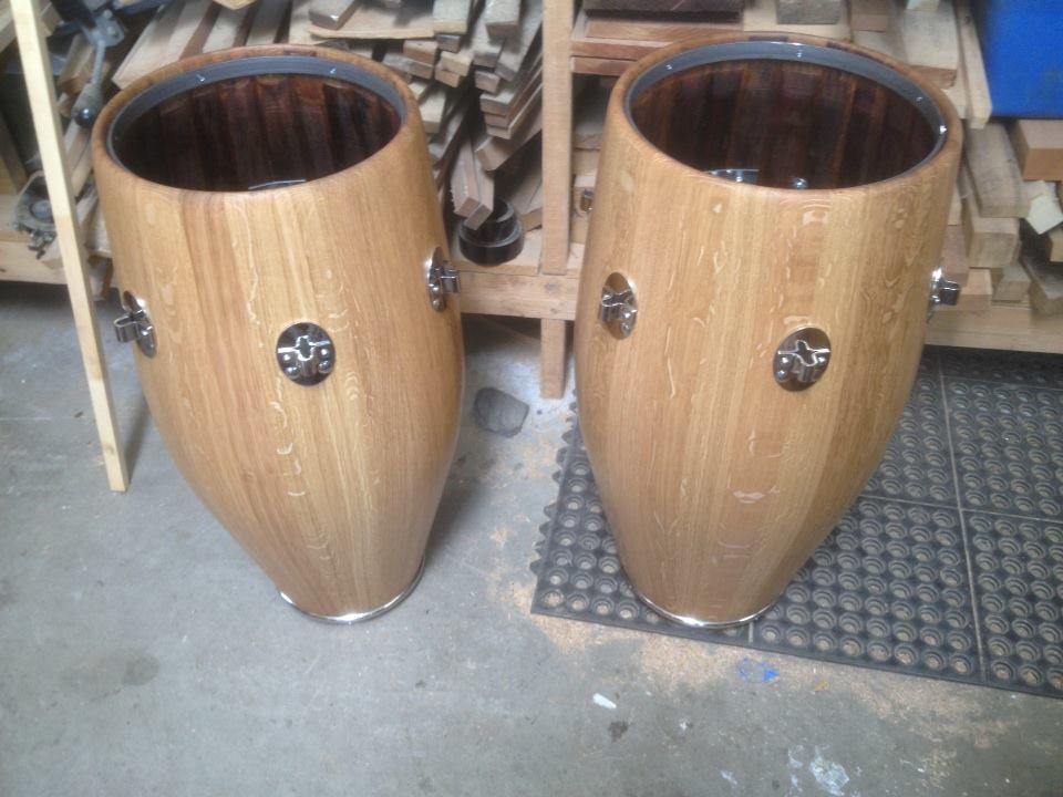 Here are some photos of Peter Musser's latest work with his PM Percussion Cuban Heritage Series Congas made form imported French wine barrels. He does some pretty amazing work. I prefer bands wrapped around drums but these are so beautiful I think I like them just the same.