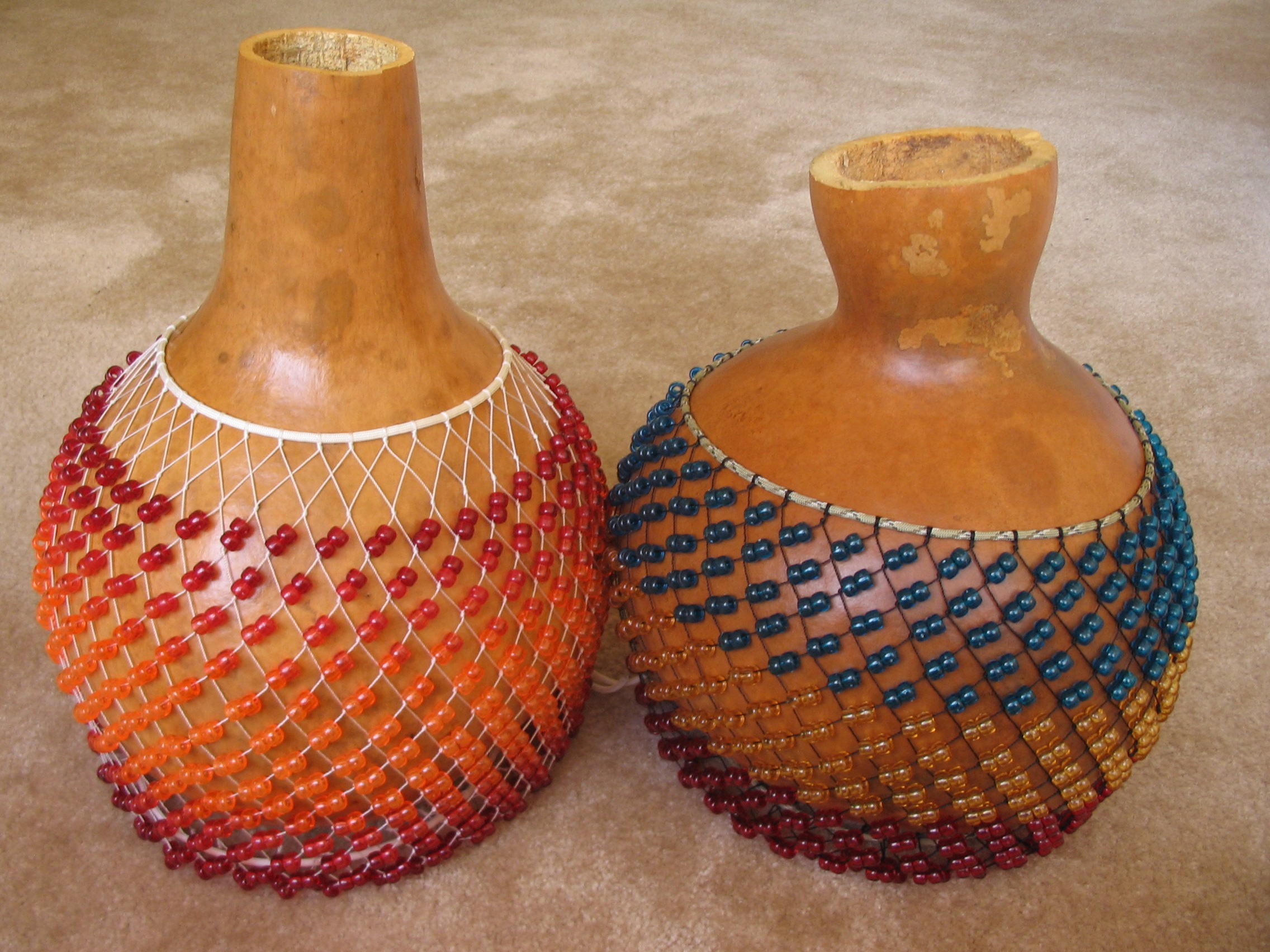 Custom Shekeres $119 (ea, price includes shipping for these): Made from very large gourds, these are "Sunburst" and "Reggae Shake". Gourds are dried, cut, cleaned, then a coat of polyurethane is applied for protection. Nets are custom made to each gourd. Current shekeres have over 1000 beads; gourds are larger than basketballs. Be seen and heard in your drum circle, band, or percussion ensemble with one of these! I've been making shekeres for over 20 years and am back in 2016 with some new instruments.