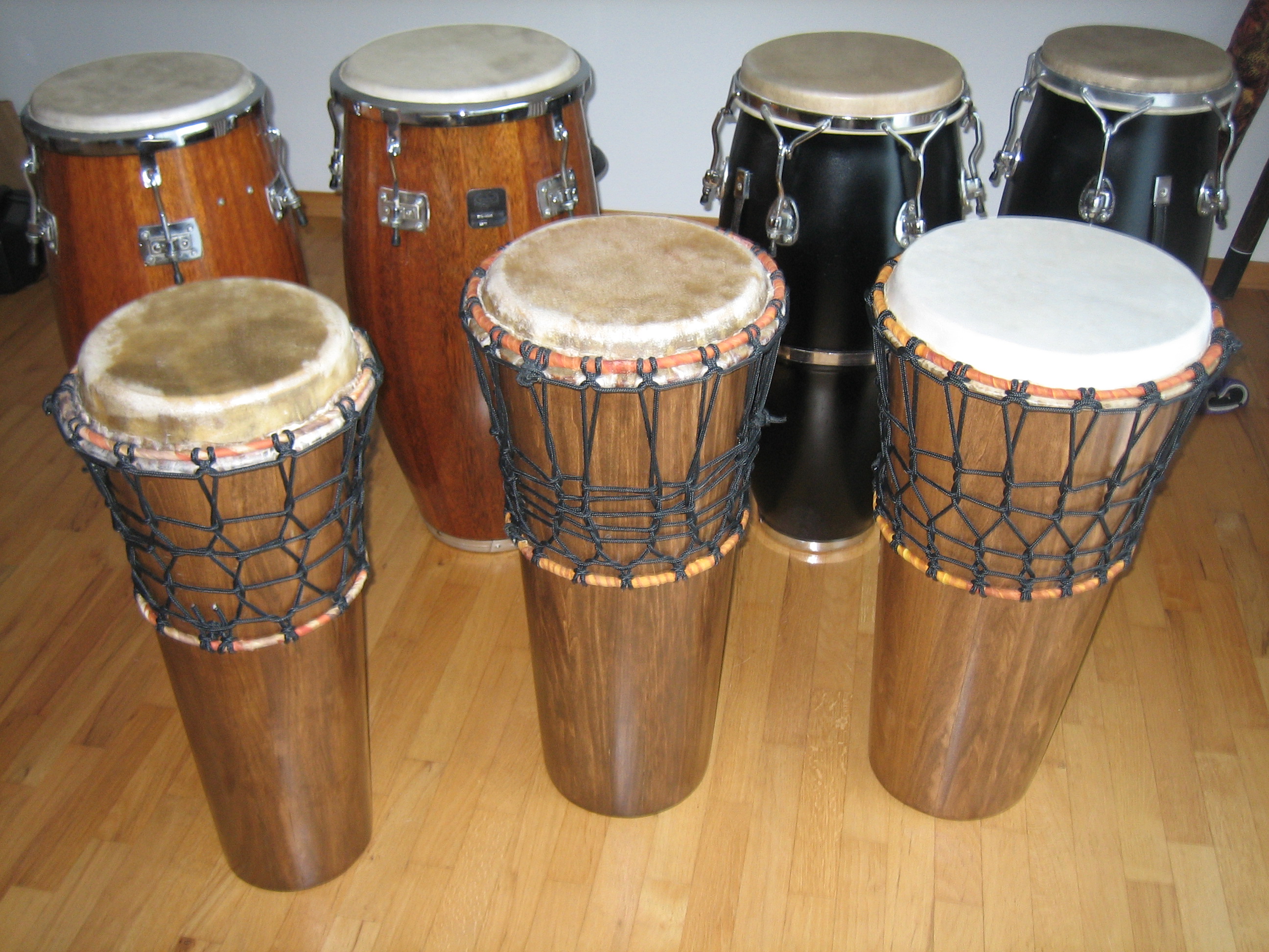 I have reheaded all three drums. I was happy with the originals. The African hide is a little softer than North American steer and gives the drums the warm sound bugarabus are famous for. But, I wanted to get crisper overtones, so I put heavier stuff on them. The smallest, Jalapeño, got a hard cowhide I had on another drum. It sounds absolutely awesome. I reheaded the other two with, believe it or not, LP conga water buffalo. The middle drum (Salsa) has a hide that had been stretched a bit. The large (Maíze) has the typical translucent LP head. Maíze, in particular has the right sound. It sounds just like a tumba. When I need it, I can get sharper sounds with the right attack.